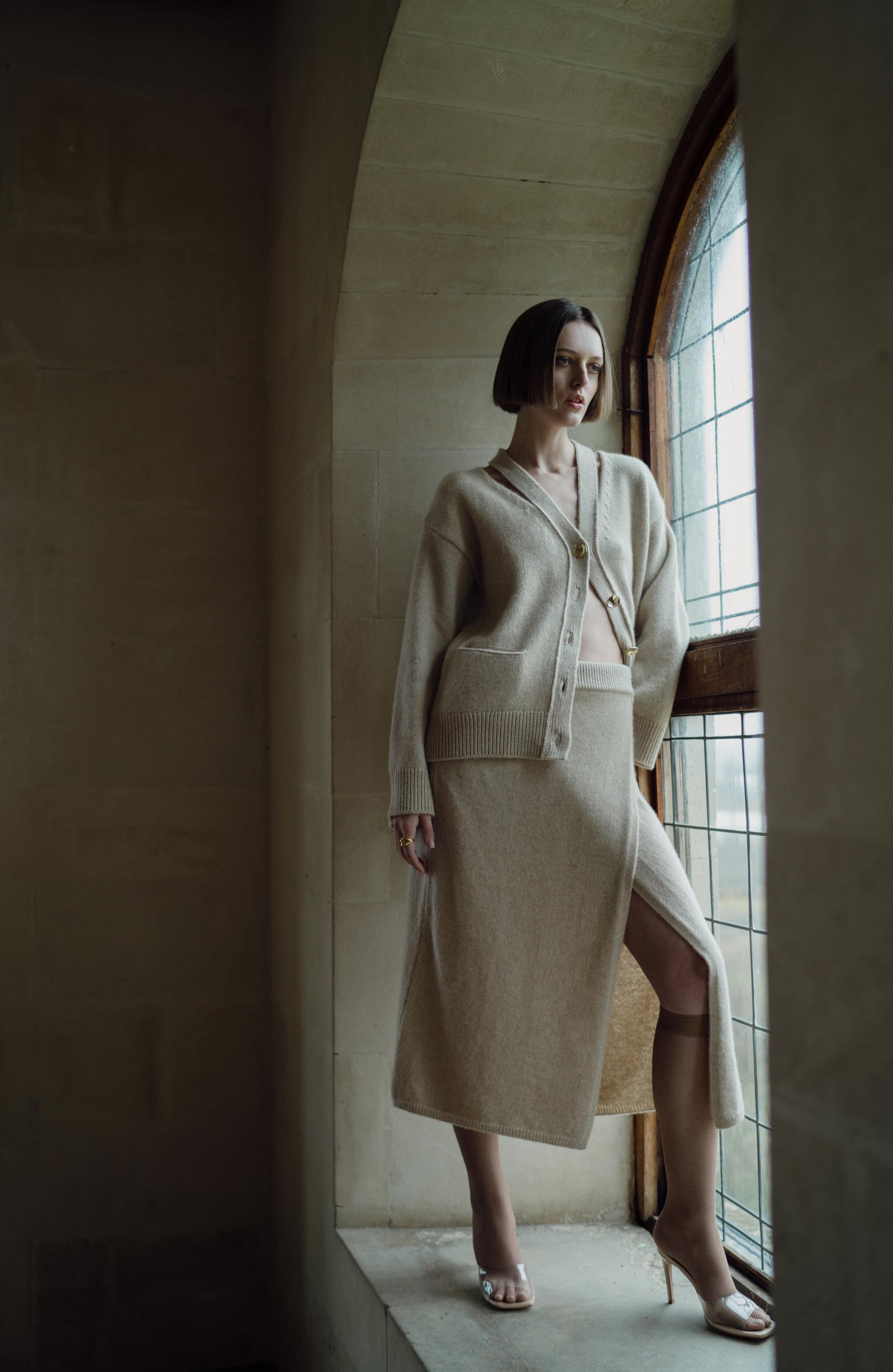 Sitting at the waist and extending below the knees, the Mila wrap skirt in Sand creates a chic and elegant silhouette, perfect for a multitude of occasions. Made from luxurious Italian cashmere with an elasticized waistband that features an Italian gold button to the side, and an adjustable tab with button closure on the inside of the waist. Fit: Bianca, our model is 5.8” or 1.76 m tall and wears size 1. Made from a medium-weight knit, the skirt is approximately 32” (80cm) long. Content: 100% eco cashmere.