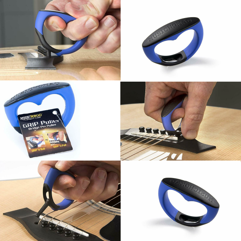 Pulling bridge pins just got a whole lot easier, safer and more fun! Music Nomad's patent pending GRIP Puller's innovative design allows you to easily pull bridge pins. Simply slide under the pin to GRIP and pull straight up. Alternately, use a rocking motion to roll back and lift the pin. It’s that easy. The ergonomic, rubber lined comfort grip design has no moving parts and is a one-handed operation. Metal free construction with a rubber exterior makes it safe on delicate wood and all bridge pin types used on acoustic guitars. That's Music Nomad quality - raising the bar in equipment care.