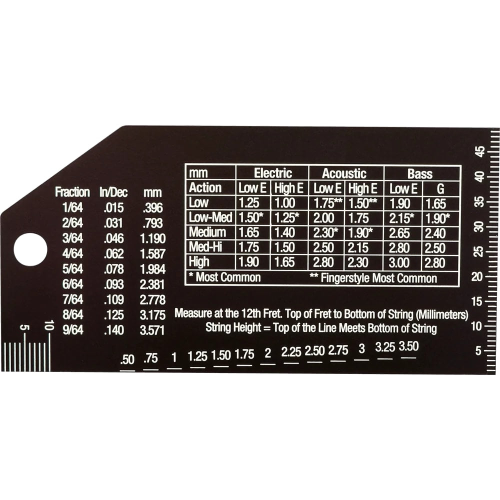- Accurate measurement of string action in multiple units ensures precise guitar setup
