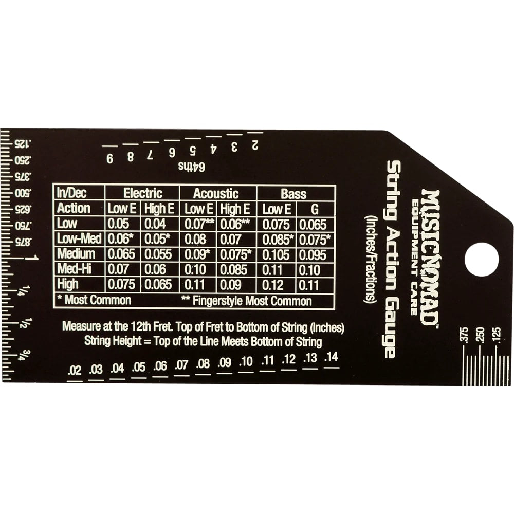 The Music Nomad MN602 is a precision guitar string action gauge designed for accurate measurement of string height and fret conditions. Ideal for guitar technicians, musicians, and guitar hobbyists, this stainless steel gauge provides multiple measurement units including inches, metric, and 64ths. It features clear white markings on a black finish for easy readability and a fret rocker side for detecting uneven fret heights. Use this tool for precise guitar setup and maintenance.