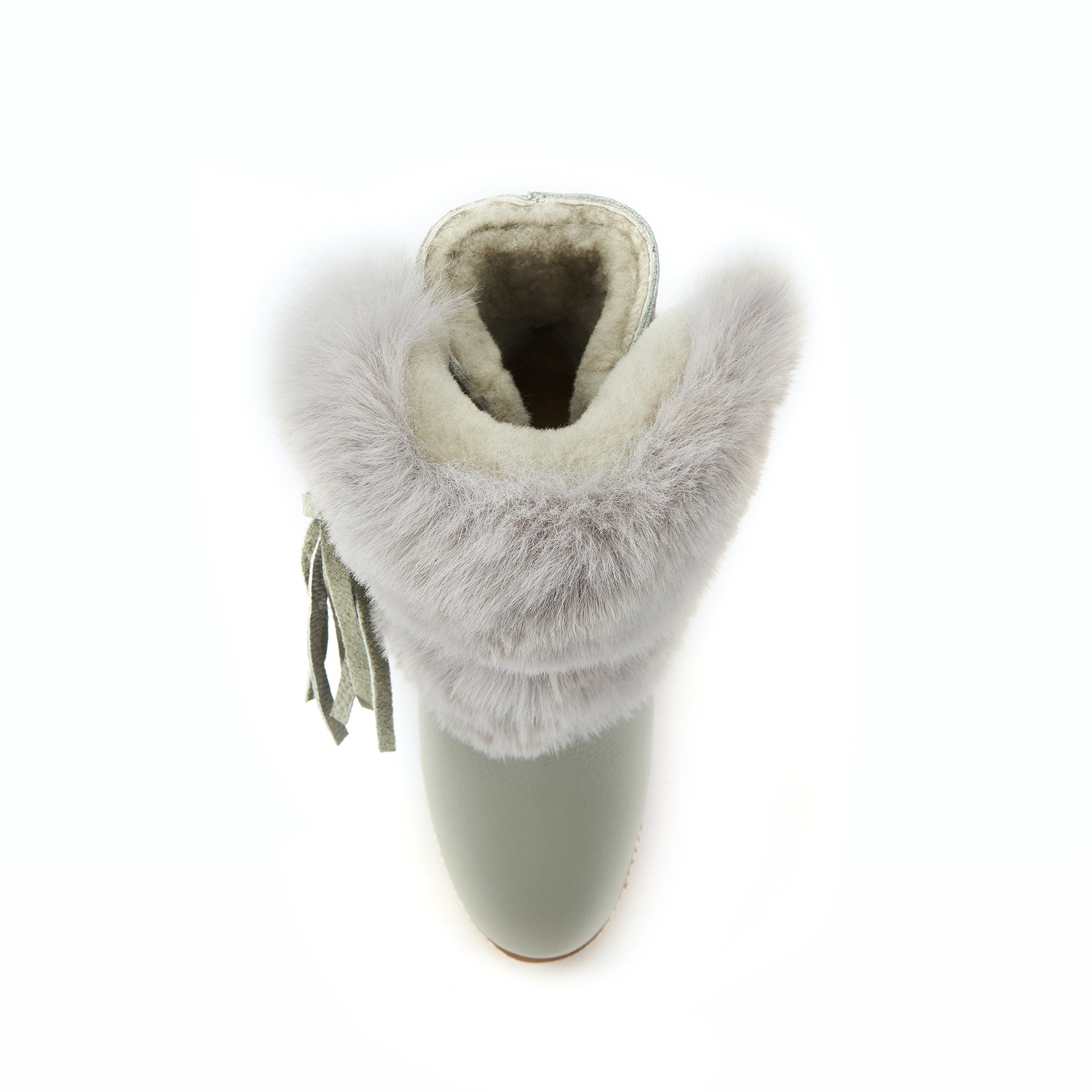 The Montreal Ice Gray is a high wedge heeled ankle boot crafted from super soft buff leather. It features leather cross straps with a leather tassel and a luxe faux fur cuff detail. The interior is lined with soft natural sheepskin, providing warmth and comfort. Ideal for individuals seeking stylish, comfortable winter footwear.