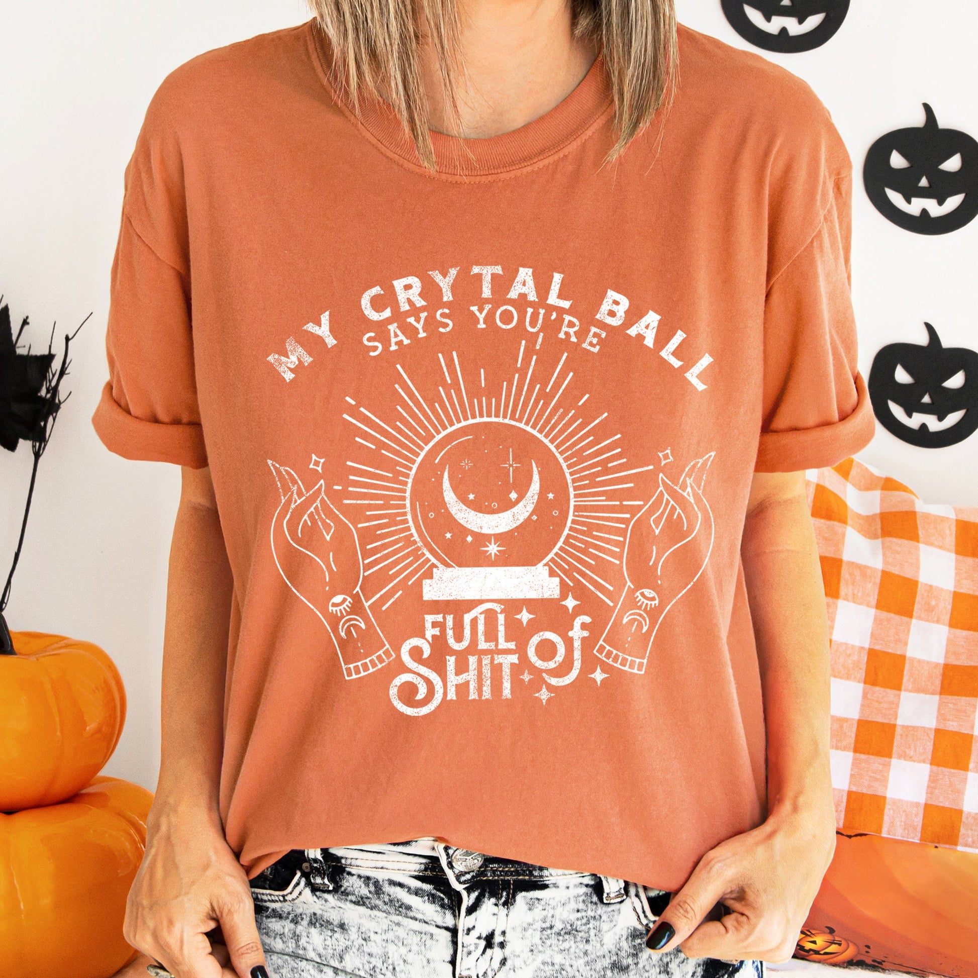 Incorporate this My Crystal Ball Says You're Full Of Shit Retro Halloween Comfort Colors T-shirt into your wardrobe for a versatile look that pairs perfectly with jeans or can be dressed up with a blazer. It's perfect for various occasions, from casual outings to festive gatherings. Don’t miss out on the chance to flaunt your unique style this Halloween—order yours today!