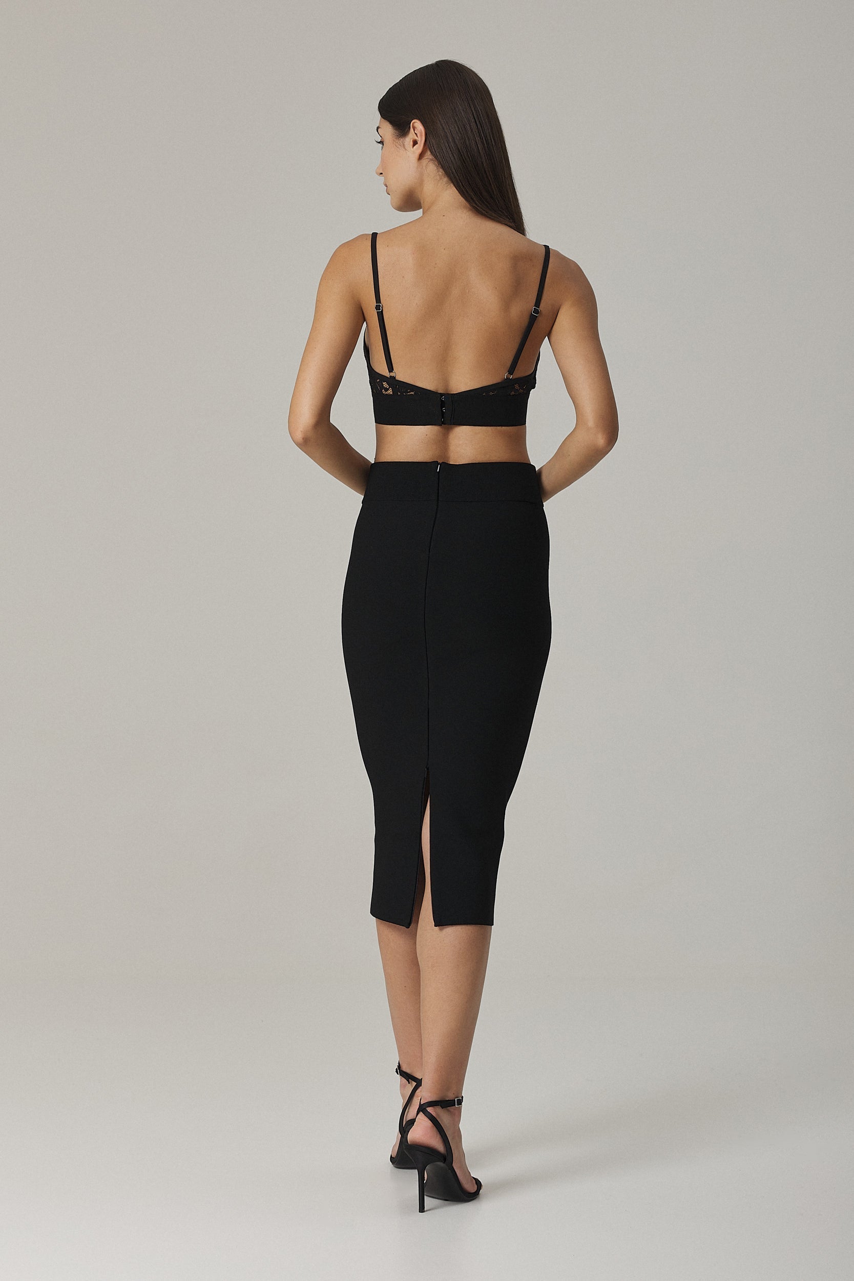 Made from a dense stretch fabric, the Naomi skirt is knitted with no side seams and features a built-in tummy compression panel for a smooth, hourglass silhouette. A center back concealed zipper that opens from the hem upwards adjusts the silhouette and enables ease of walking. Wear yours with the matching bralette or with an oversized sweater for a dressed down attitude. Featured in Black.