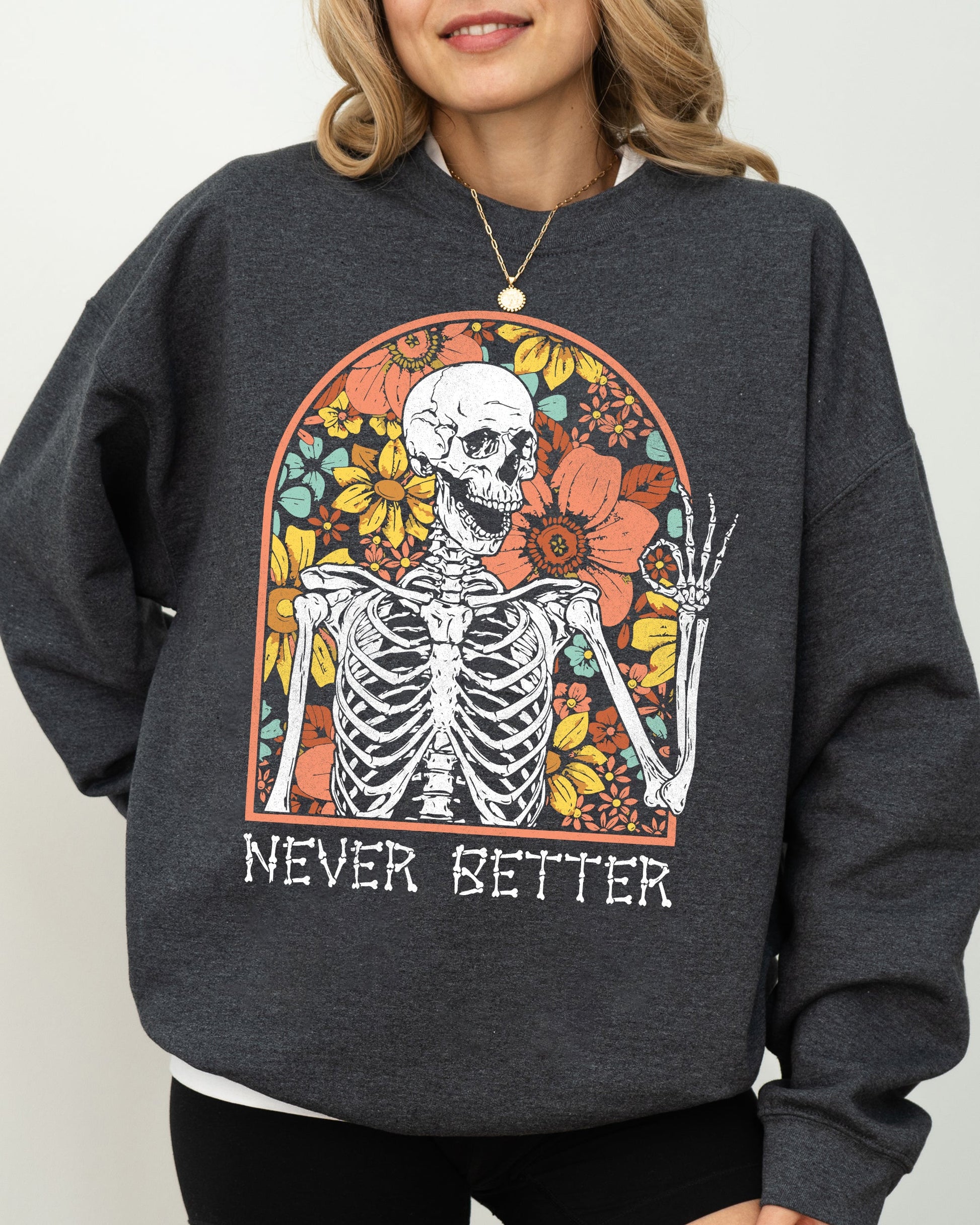 Never Better, Floral Skeleton, Witch, Ghost, Skull, Spooky, Aesthetic, Meme, Halloween, Costume Sweatshirt