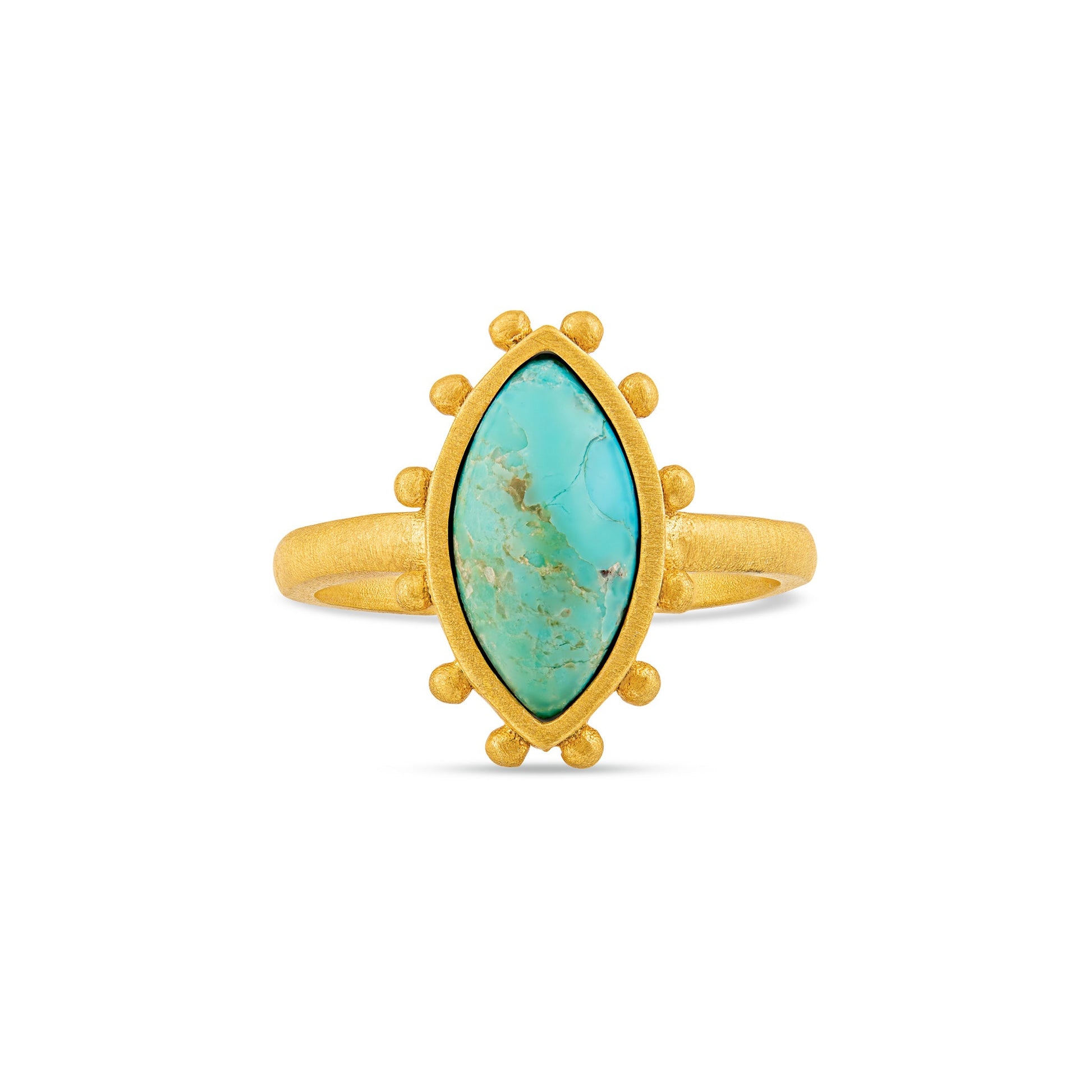 Sweet and easy, the North Star Ring is a beautiful way to add a pop to every outfit. This ring features an oblong turquoise stone set into 18K gold-plated brass. Accented by small studs for beautiful texture, this hypoallergenic ring is a playful look. An open back allows the wearer to size this ring to their preference and wear on whichever finger they prefer. Team the North Star Ring with the Starburst Cuff or Starburst Stud Earrings for a polished styling.