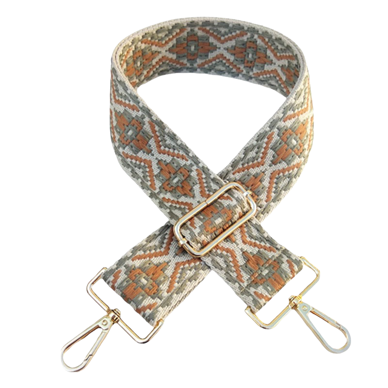 The Olive Medallion Bag Strap is a cotton embroidery crossbody strap designed for purses. It features gold hardware attachments on both ends and an adjustable length from 31.5 inches to 52 inches. Suitable for anyone looking to change the look of their purse and outfit with a stylish, functional strap.