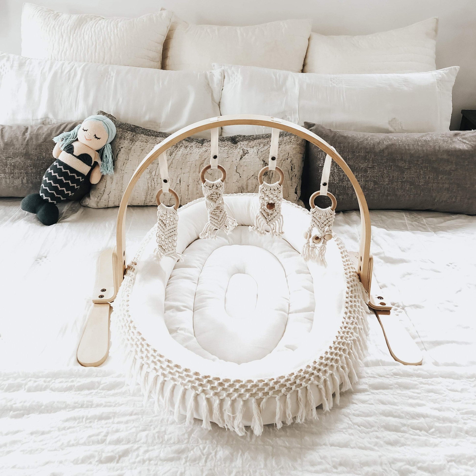 Our new boho-chic play mat lends a dreamy vibe to any decor, so you can stop stashing your little one's playmat away when you have guests. Made of organic cotton with macramé fringe—and a removable, machine-washable cover—this playmat is perfect for infants up to nine-months old. Placed on the floor, or a bed, it provides a safe and comfy spot for supervised relaxing or playing (or even diaper-changing!). It's easy to move from room to room, as well as outside, or to grandma's! You can also use our baby play gym on top of the playmat, for added entertainment for your child. This is the ultimate "must-have" item for baby this season!