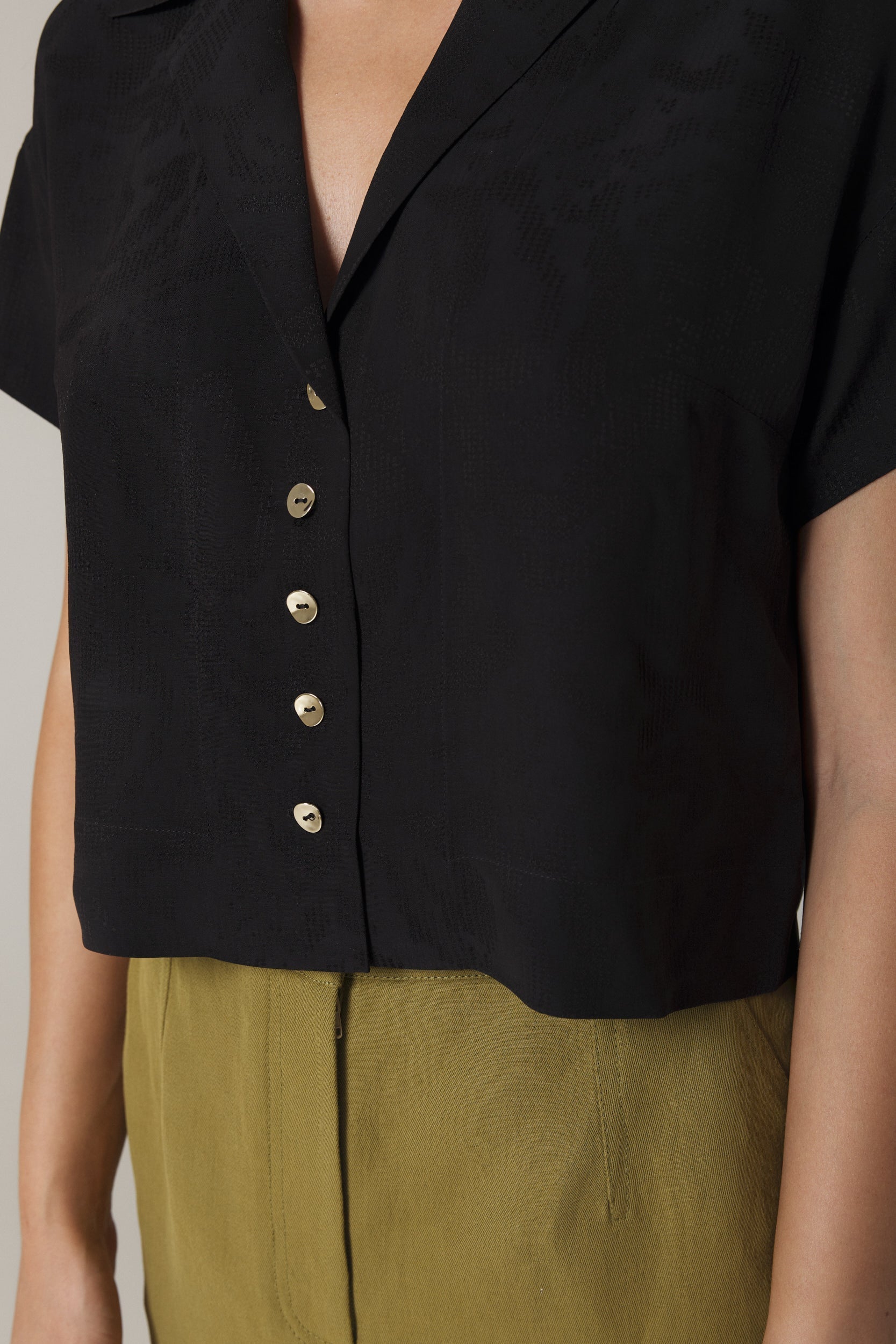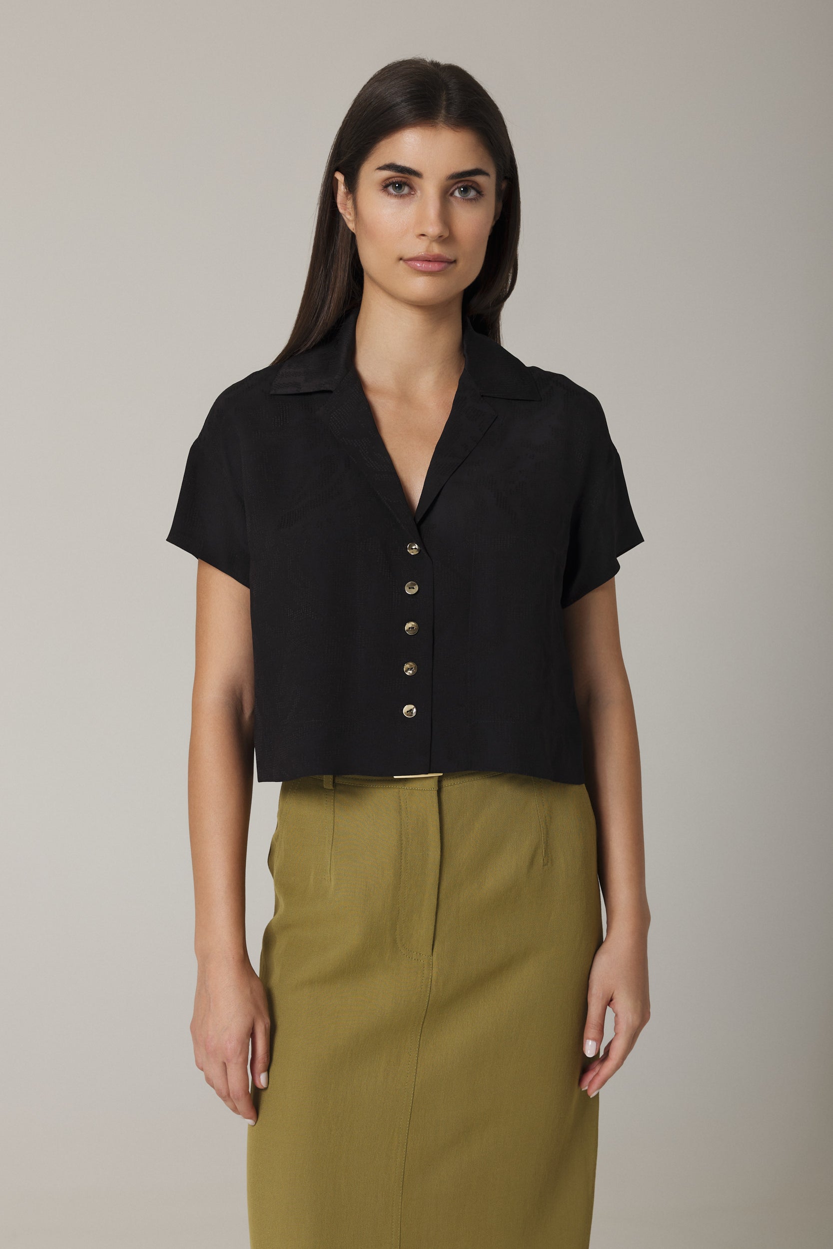 Made from a lux viscose jacquard sourced from Italy, the Paola shirt features drop shoulders, a relaxed silhouette and hammered gold metal buttons. Perfect from day to night, wear yours with a pair of trousers, favorite jeans or a pencil skirt. Shown here in Black.