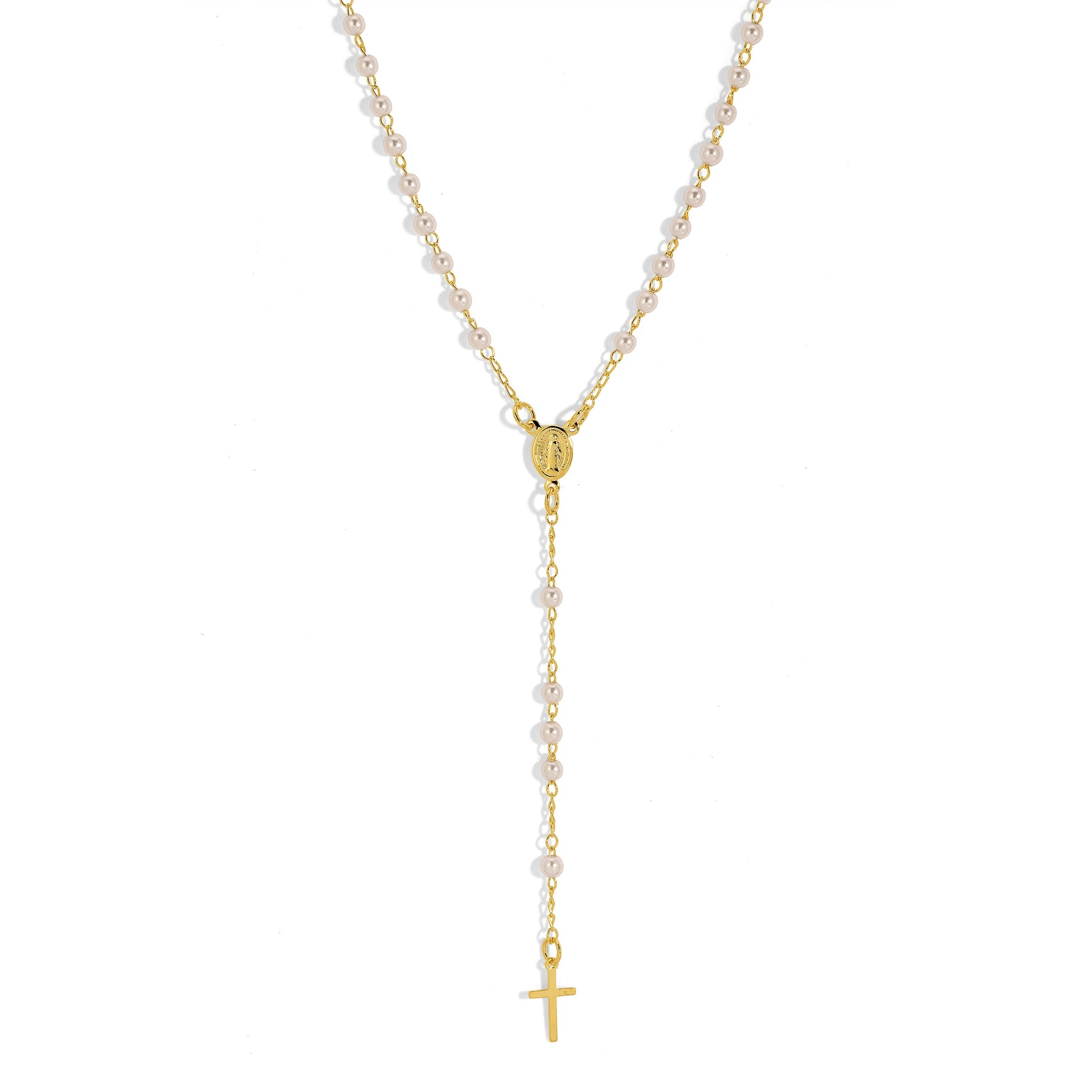 Combine faith and fashion with the Pearl Rosary Necklace. Featuring a delicate rosary pearl design with dangling cross, it's an easy way to add a touch of divine charm to your daily wear.