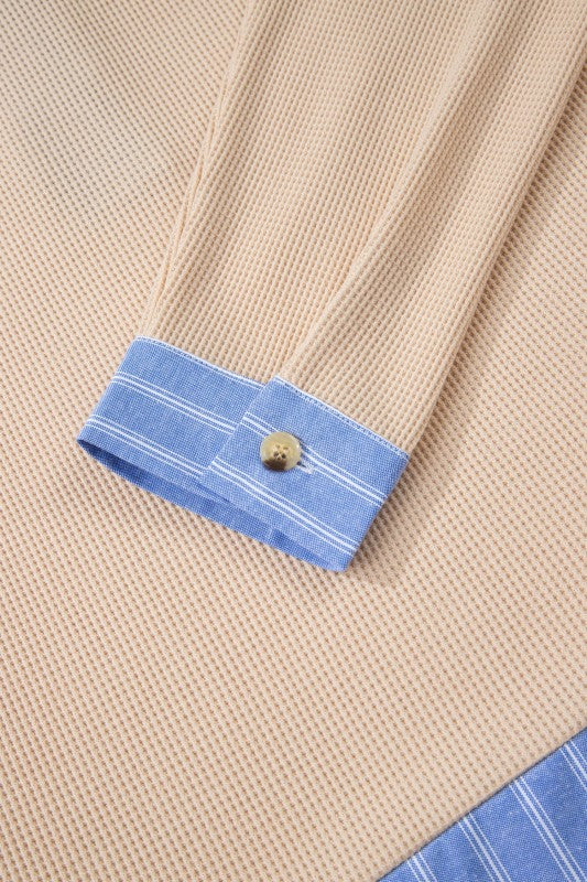 plus size stripe top waffle knit button cuffs relaxed fit plus size waffle knit top stripe contrast trim top plus size casual knitwear button accented knit top collared plus size top