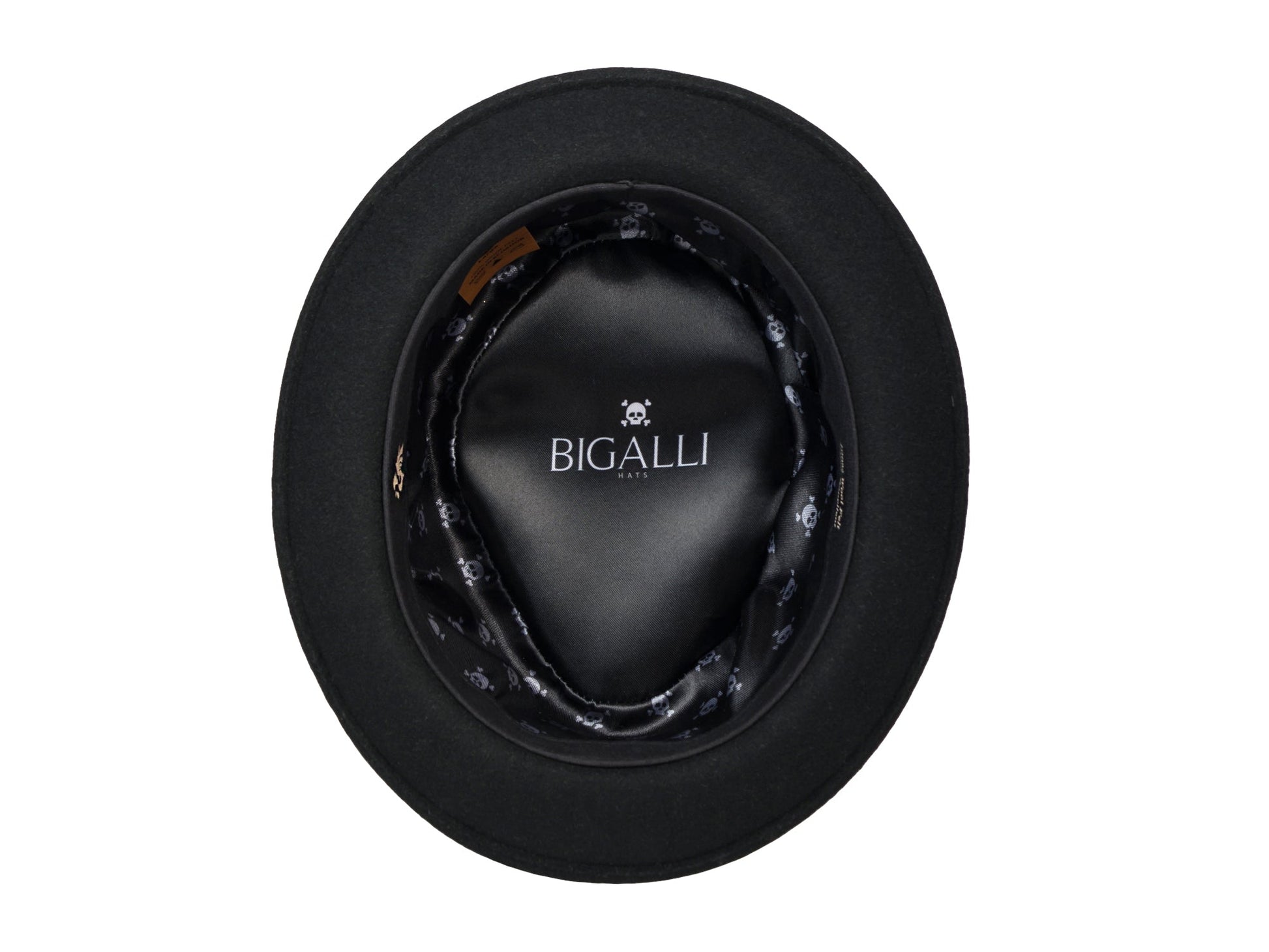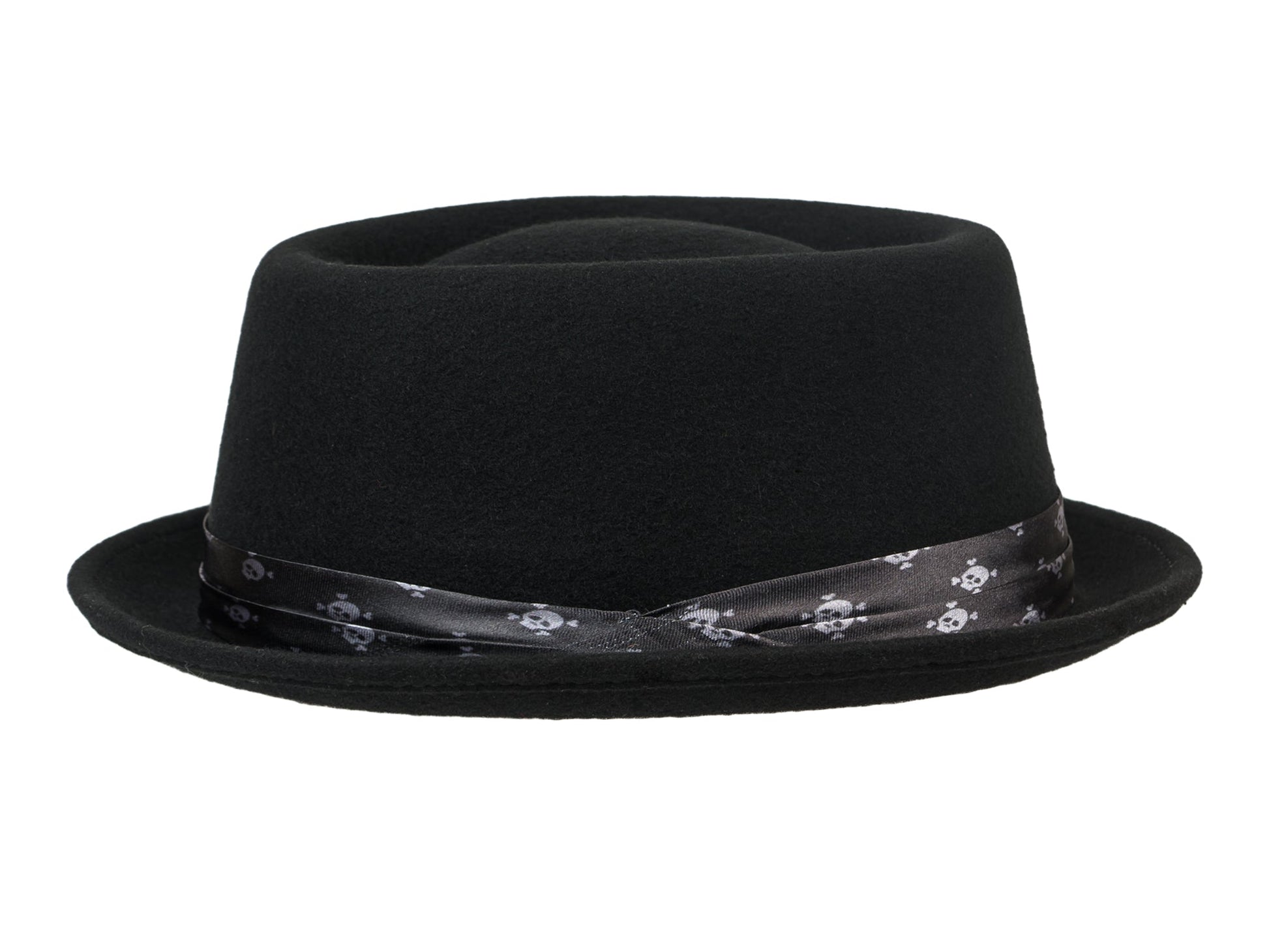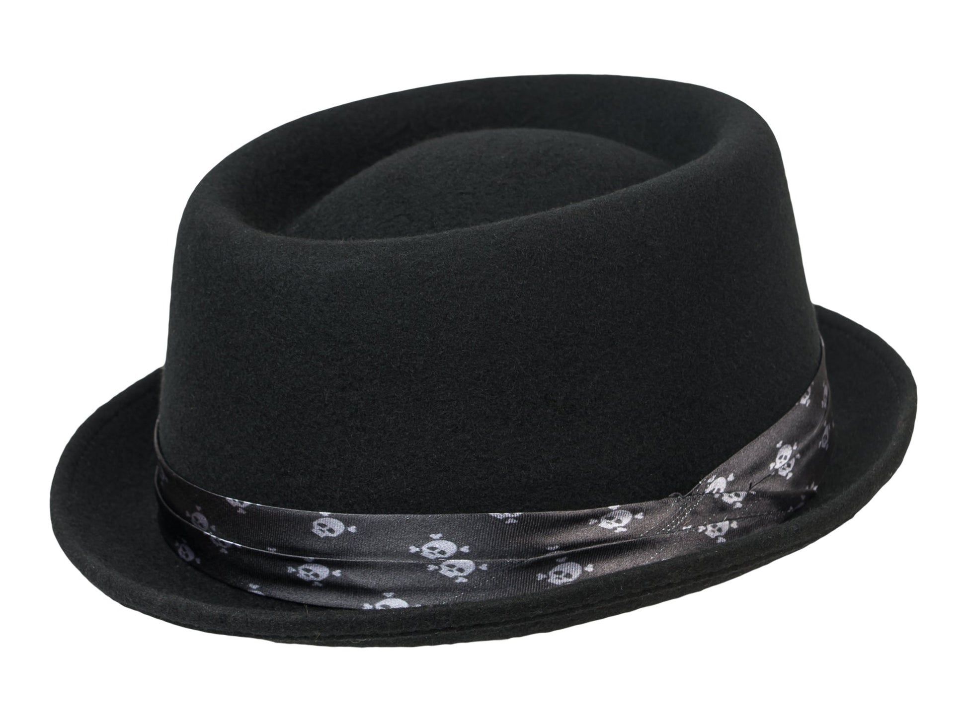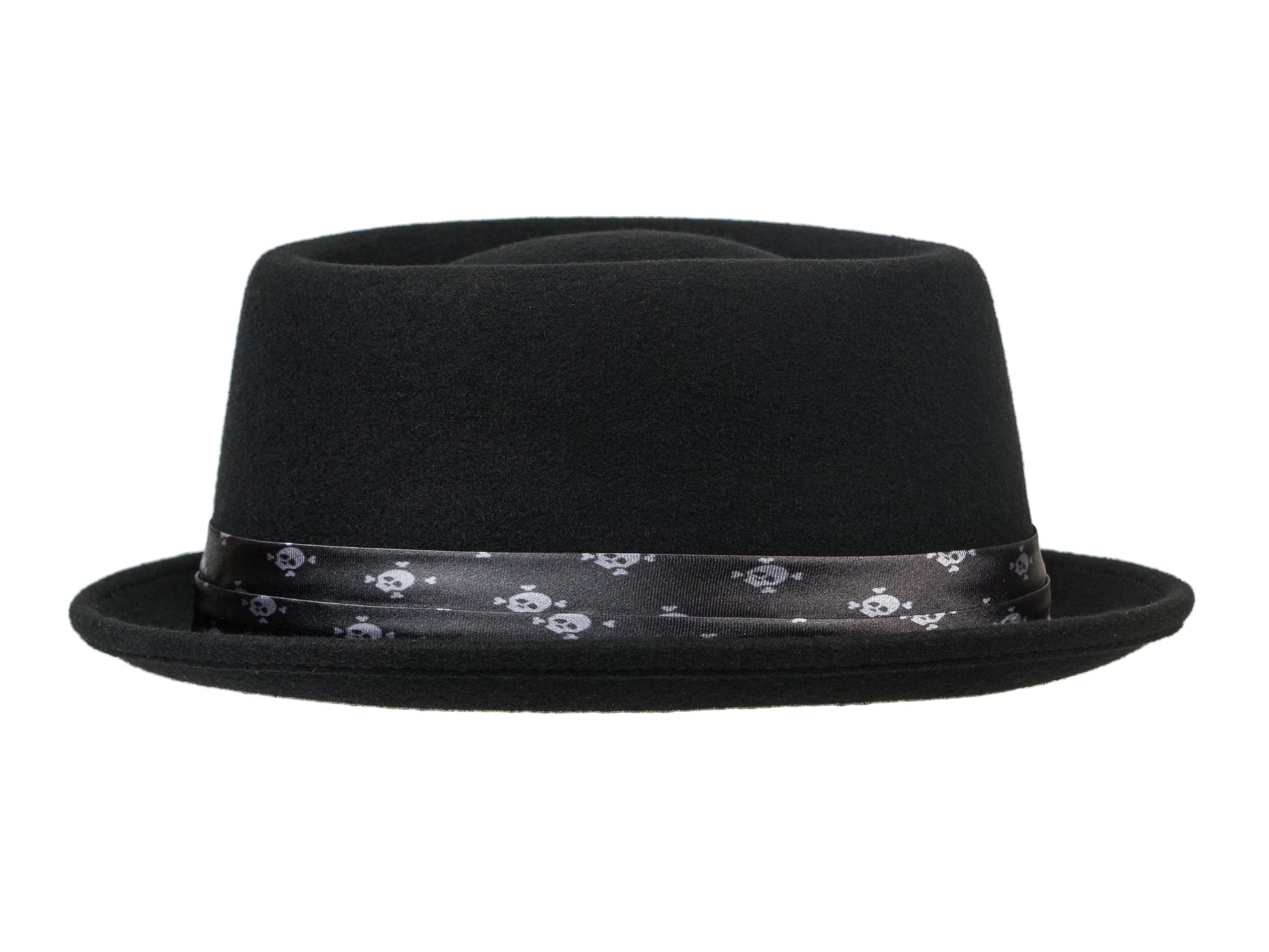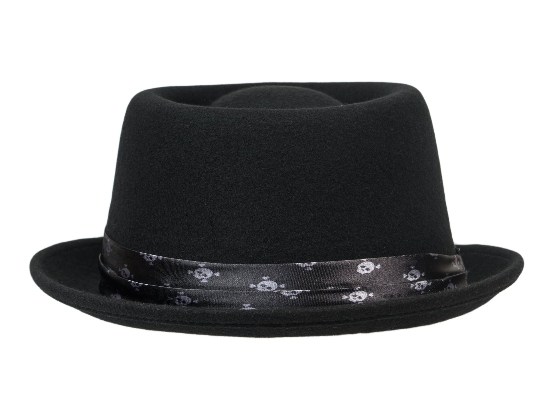 Add a touch of modern style to your wardrobe with our Pork Pie Bones Wool Felt hat. Featuring a unique skull design, this hat is not only fashionable but also edgy. Stand out from the crowd with this eye-catching accessory!