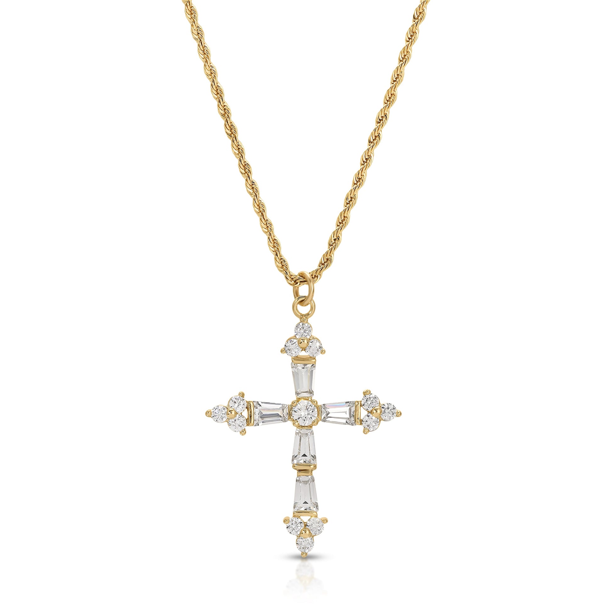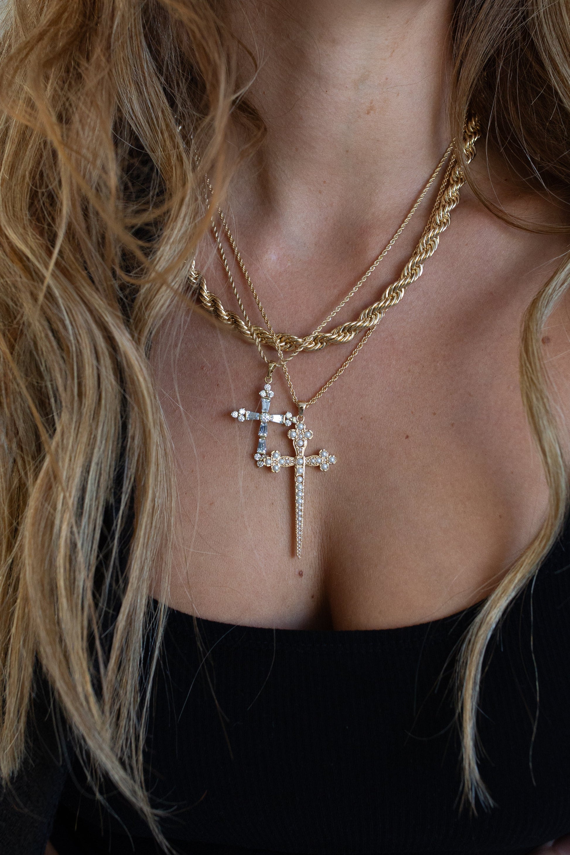This perfectly ornate cross hangs from 18 inches of twisted rope chain.