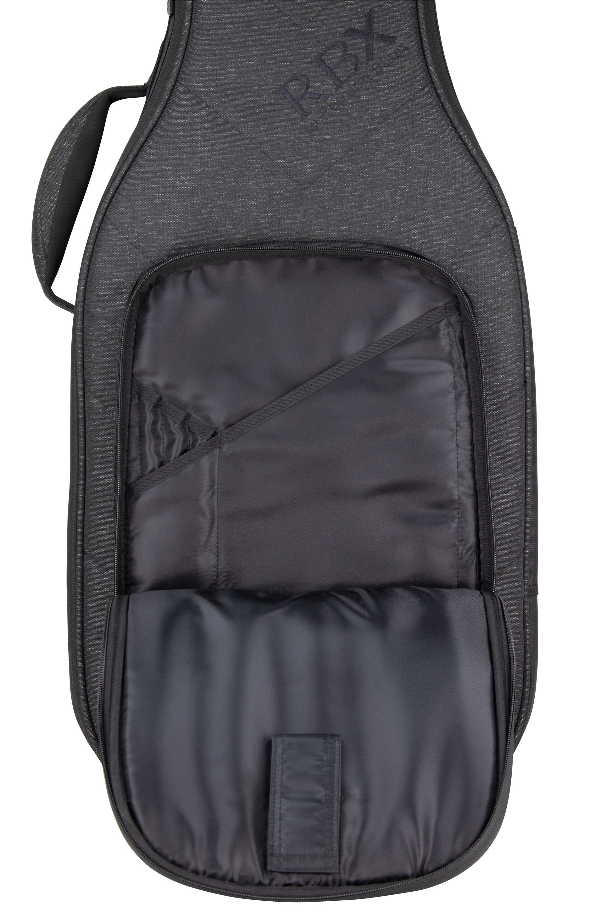 The dark grey heathered polyester exterior, accented with a quilted chevron pattern, offers a stylish yet durable finish. Inside, a plush blue velvet lining cradles your instrument in luxury. The RBX protection system features a multilayer foam surround, impact panels, a dense foam neck cradle, and an endpin rest, ensuring your guitar stays safe and secure.