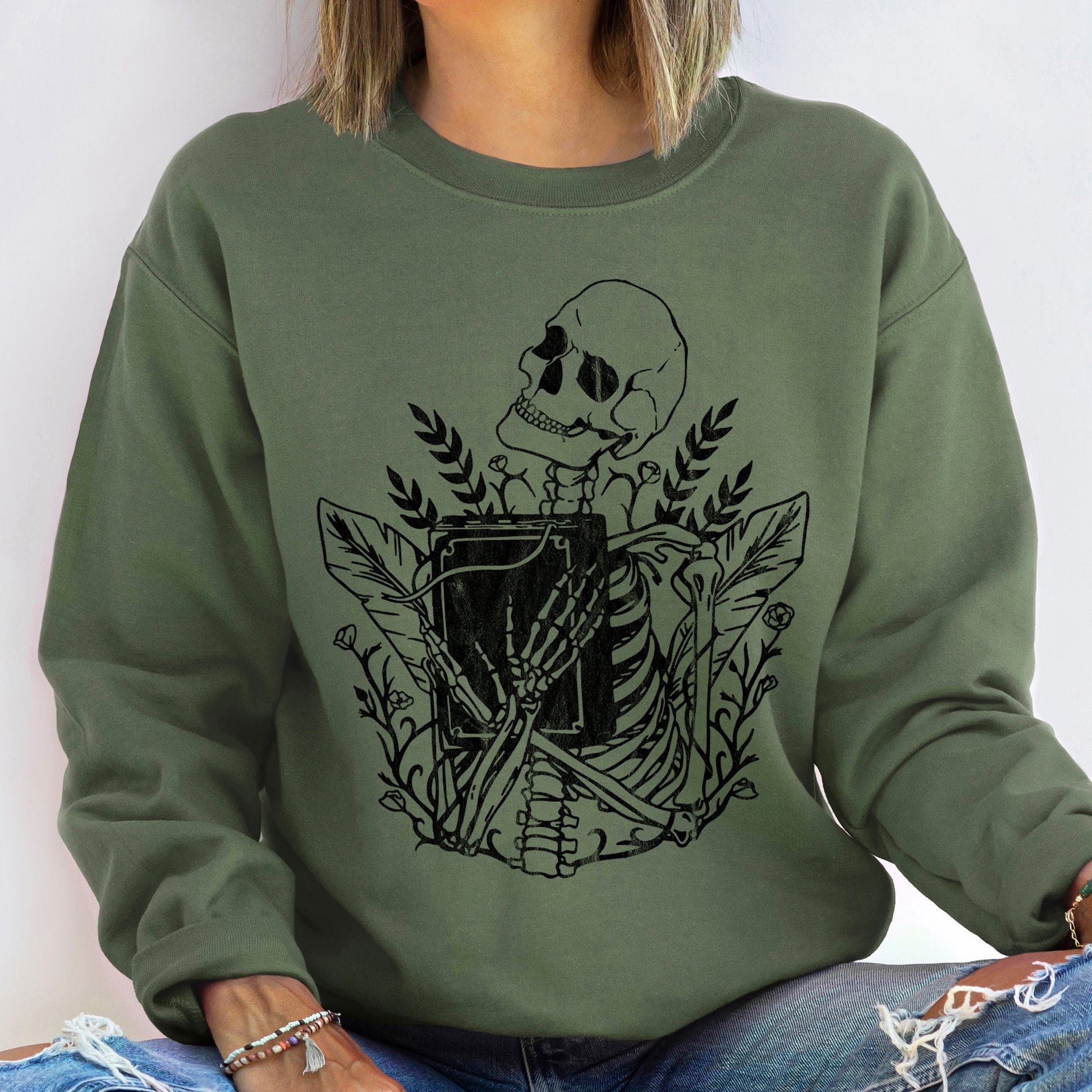 Style your Reading Skeleton Vintage Halloween Sweatshirt with jeans for a relaxed yet fashionable look. Perfect for casual outings, Halloween parties, or cozy nights in, this sweatshirt will keep you comfortable while you celebrate in style.
