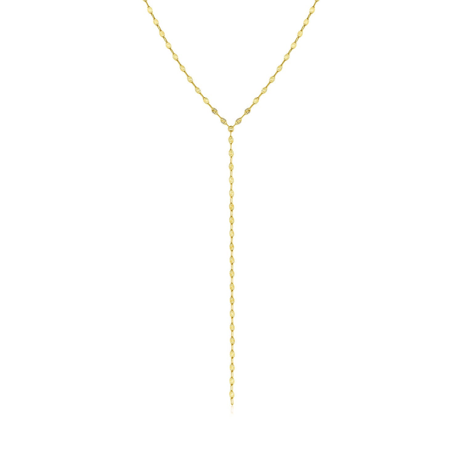 This 14k gold filled starburst lariat necklace features a 2.5mm starburst design with a 20-inch chain plus a 5-inch drop and a lobster clasp. It is designed for individuals seeking a delicate and adjustable necklace suitable for both casual and formal occasions. The lariat style allows for versatile styling options.