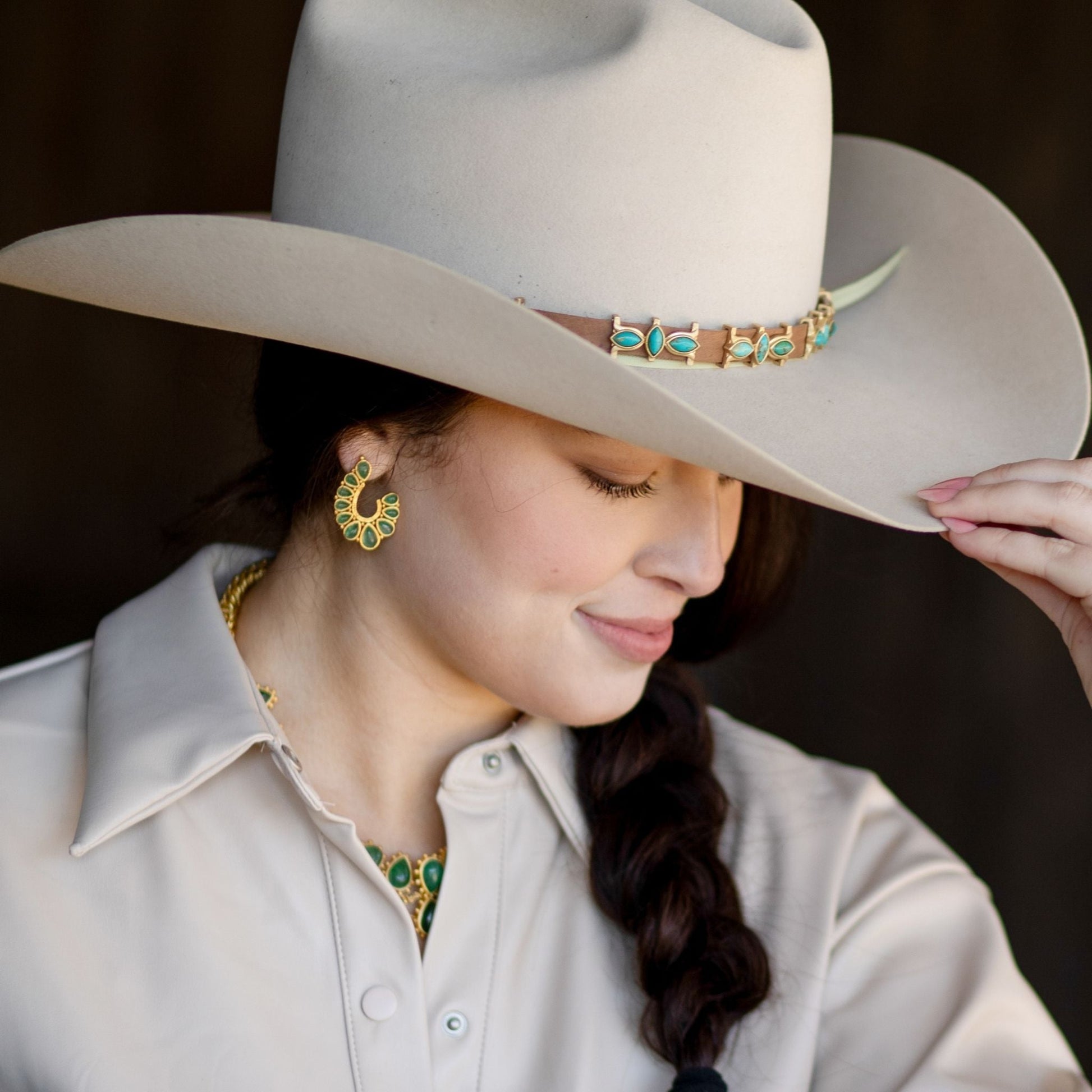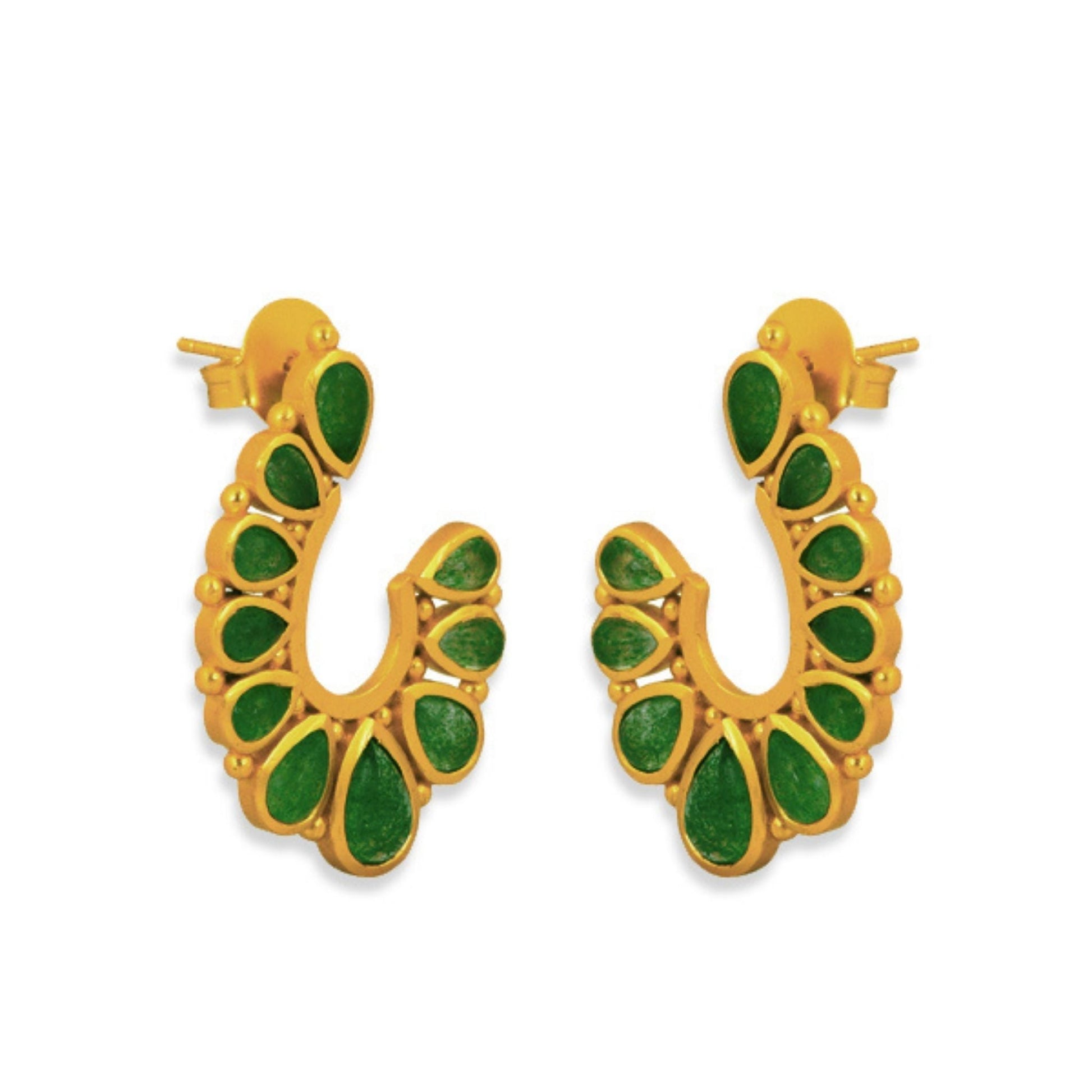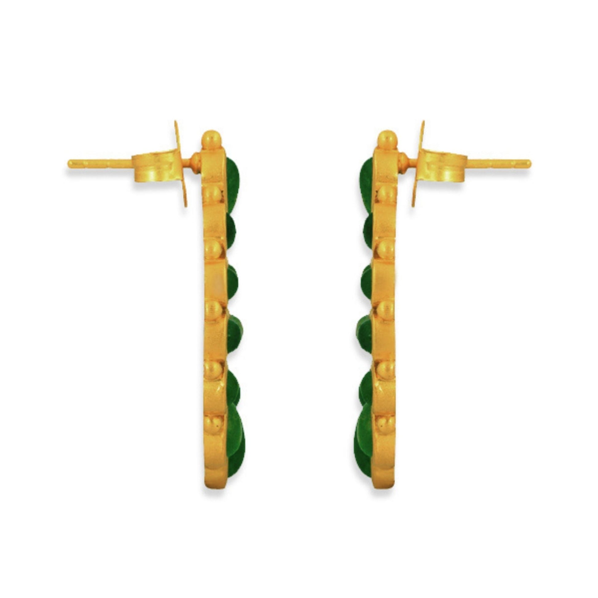 Emulating the flow of our favorite southwestern rivers, the Riverbend Earring is a trend-forward look. Featuring a wave of teardrop green strawberry quartz stones in contrasting sizes to add texture, this stud-meets-drop earring is stunning. Set into 18K gold-plated brass with studded details throughout, these earrings are hypoallergenic. A post-back makes for effortless and secure wear. Team the Riverbend Earring in green strawberry quartz with the Rio Collar Necklace and Tucson Eternity Ring for a polished styling.