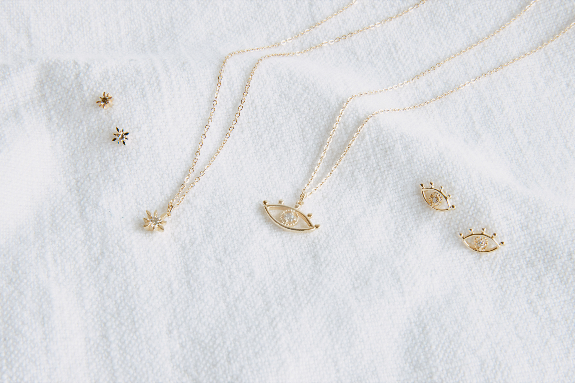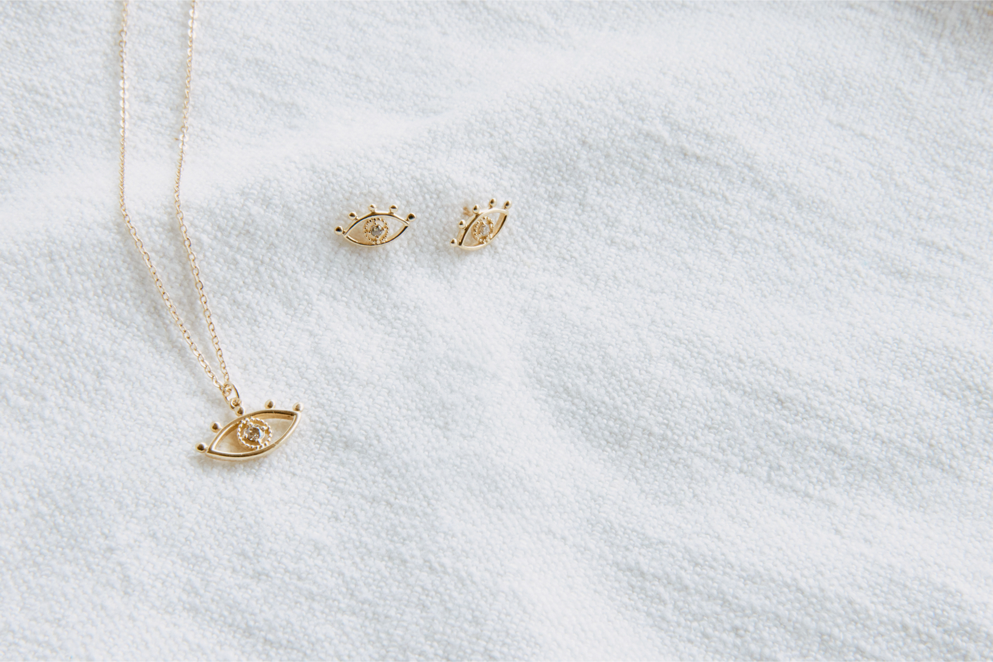Evil Eye Charm Necklace 14k Yellow Gold Santorini Necklace Set & Stones