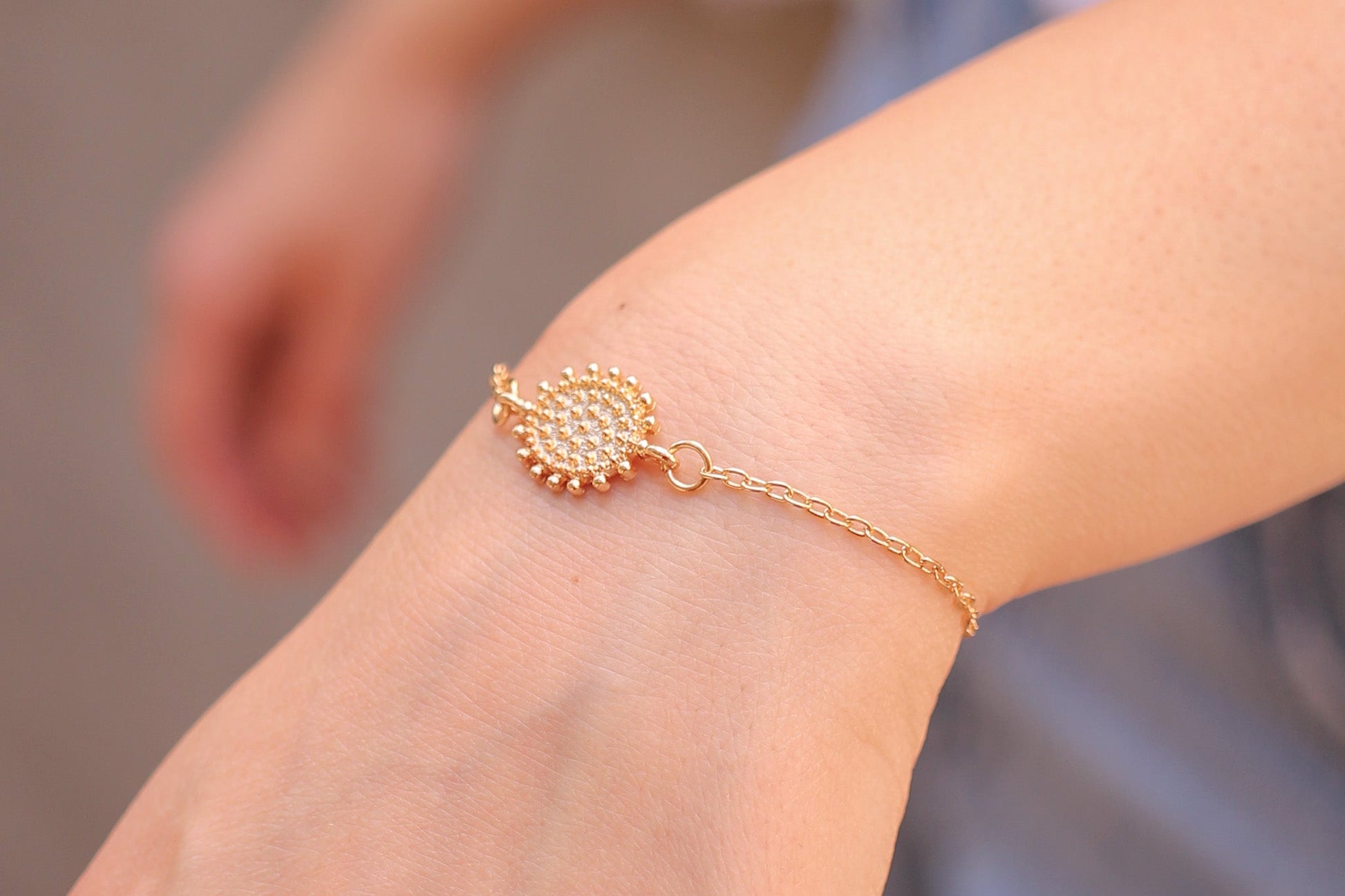 This bracelet is made with a gold-plated stainless steel and can be adjusted from approximately 6.2in.-8.2in. in length.