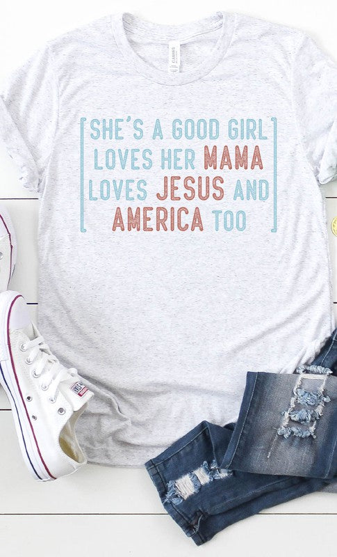 Shes a Good Girl Graphic Tee PLUS. Most t-shirt colors are 52/48 cotton/polyester blend. Athletic Heather & Black Heather are 90/10 cotton/polyester. White, cream, pink, canvas red, lilac, mint are 100% cotton. Ash is 99/1.