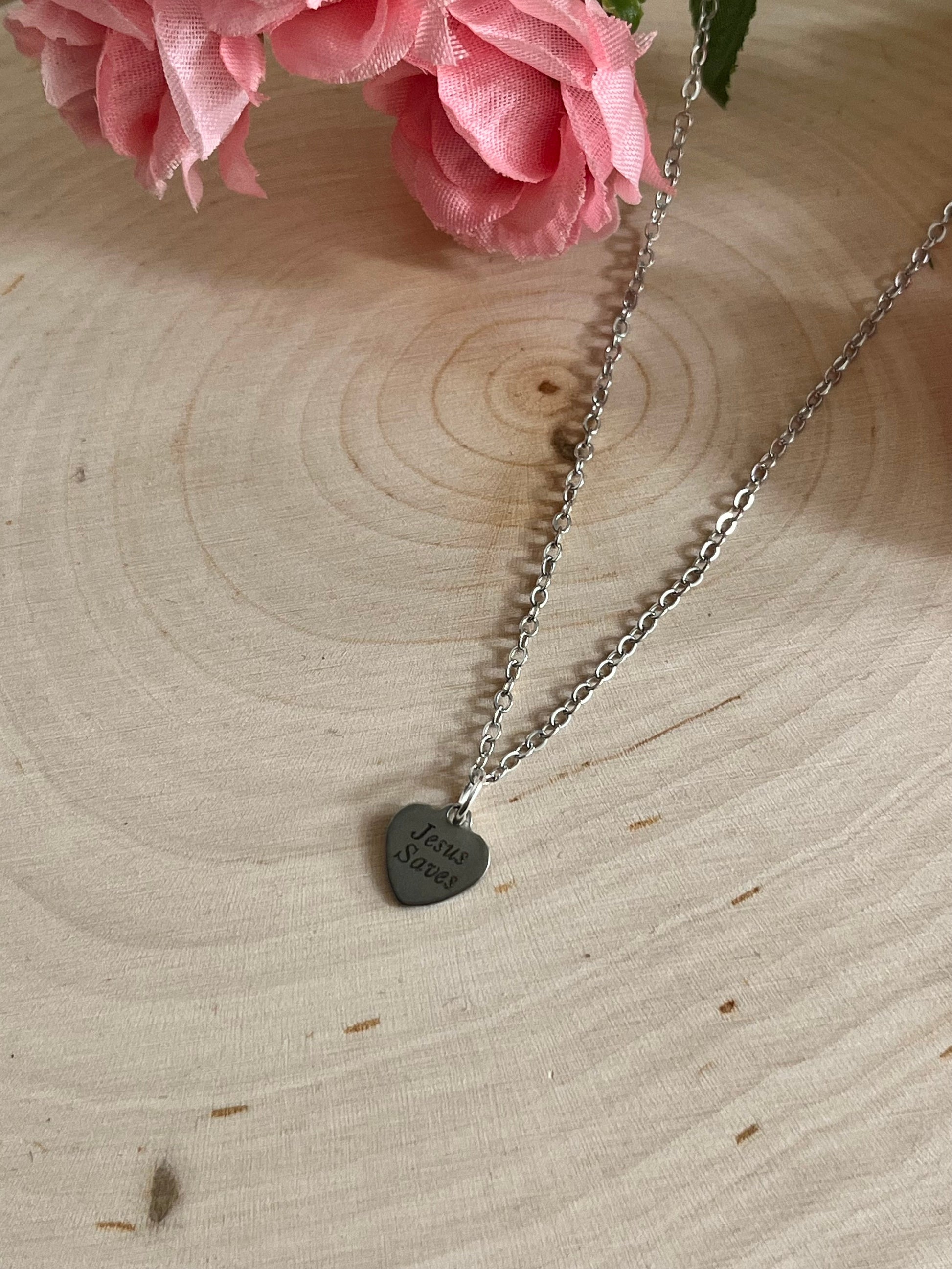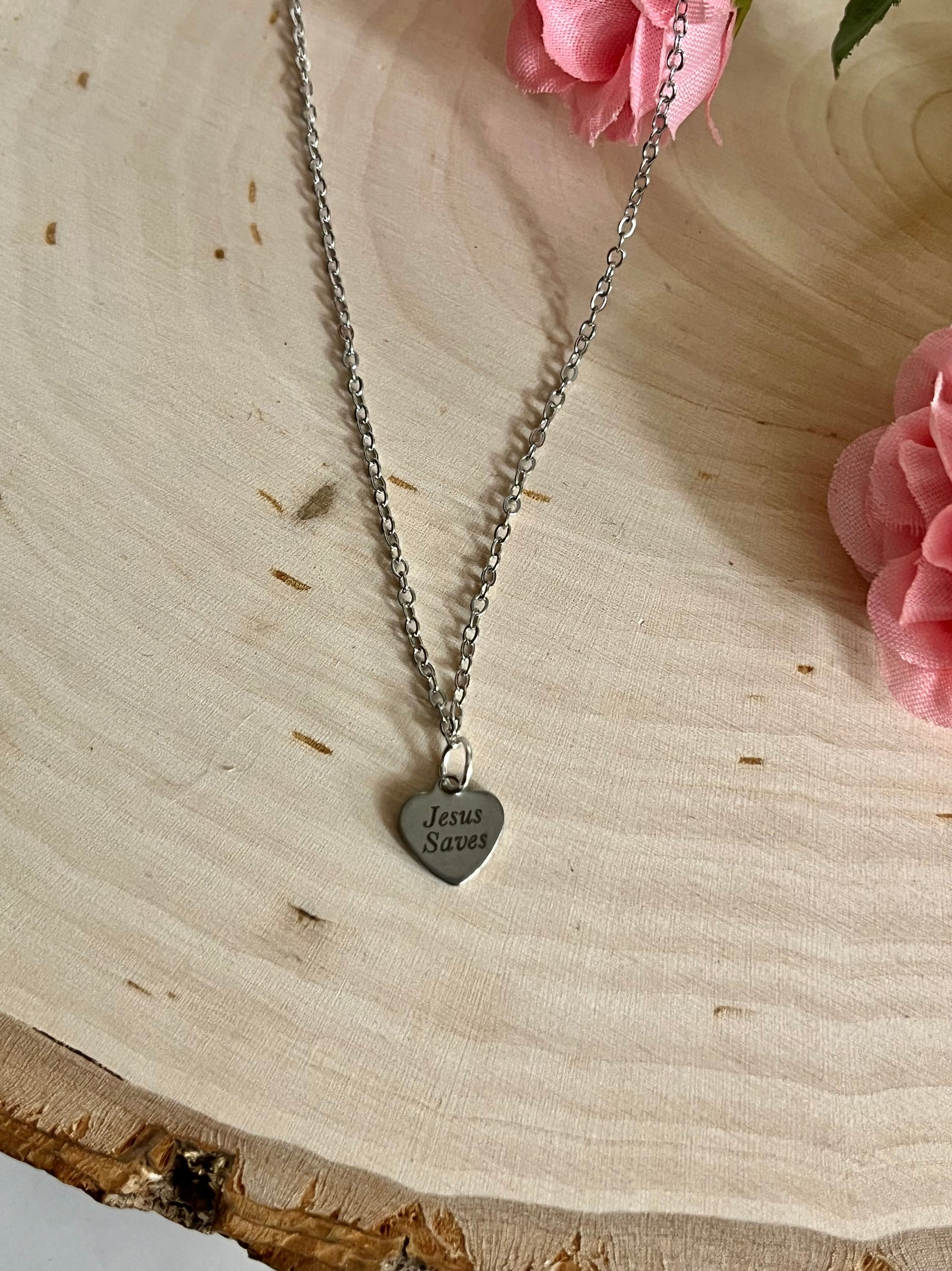 This silver necklace is a meaningful reminder of faith and salvation. It features a stainless steel Jesus Saves charm that is laser engraved, hypoallergenic, and anti-tarnish, ensuring durability and long-lasting wear. The charm measures 10x9mm, making it a subtle yet powerful statement of belief.