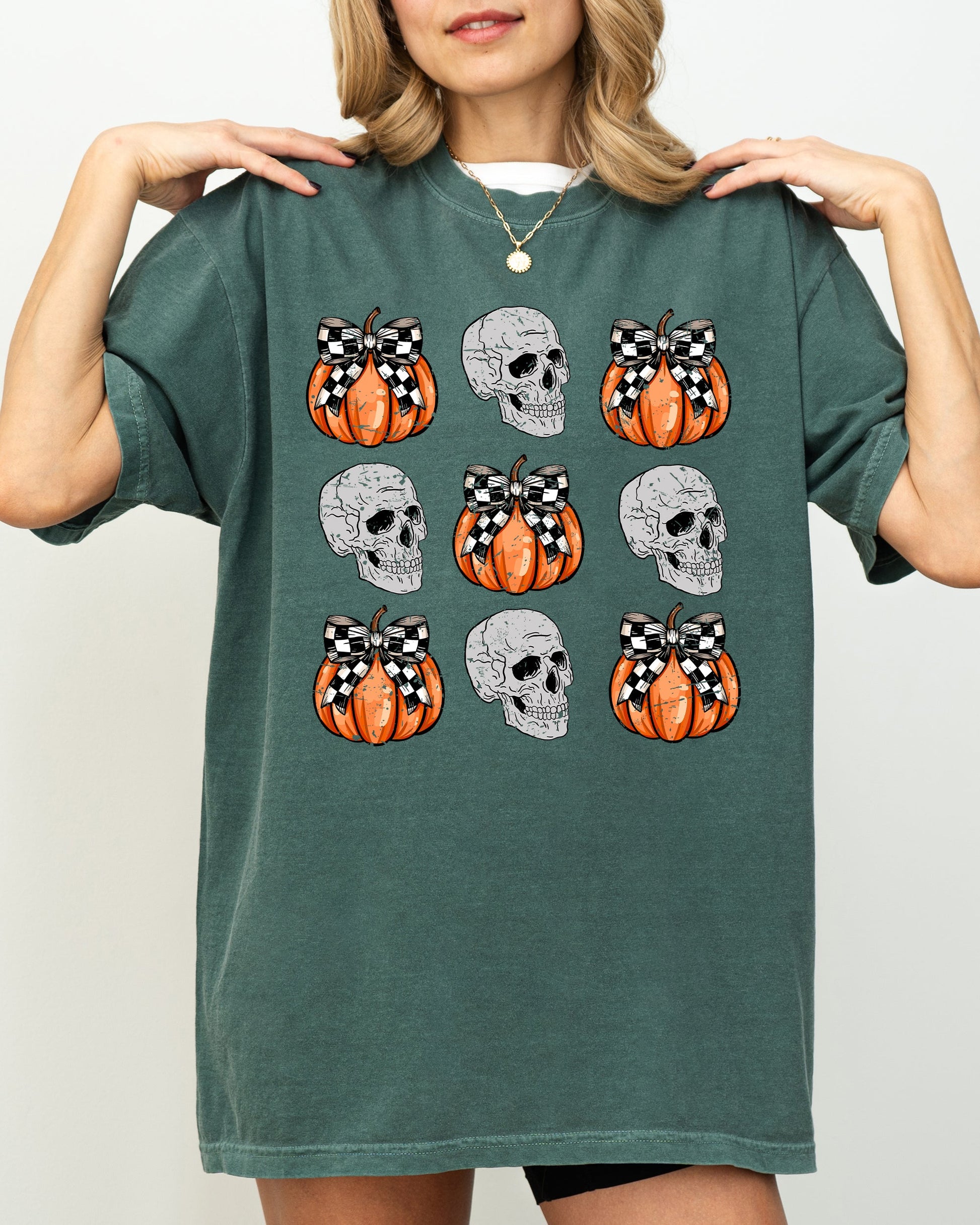 Skulls and Checkered Pumpkins Coquette Ribbons and Bows Halloween Fall Autumn Comfort Colors T-Shirt
