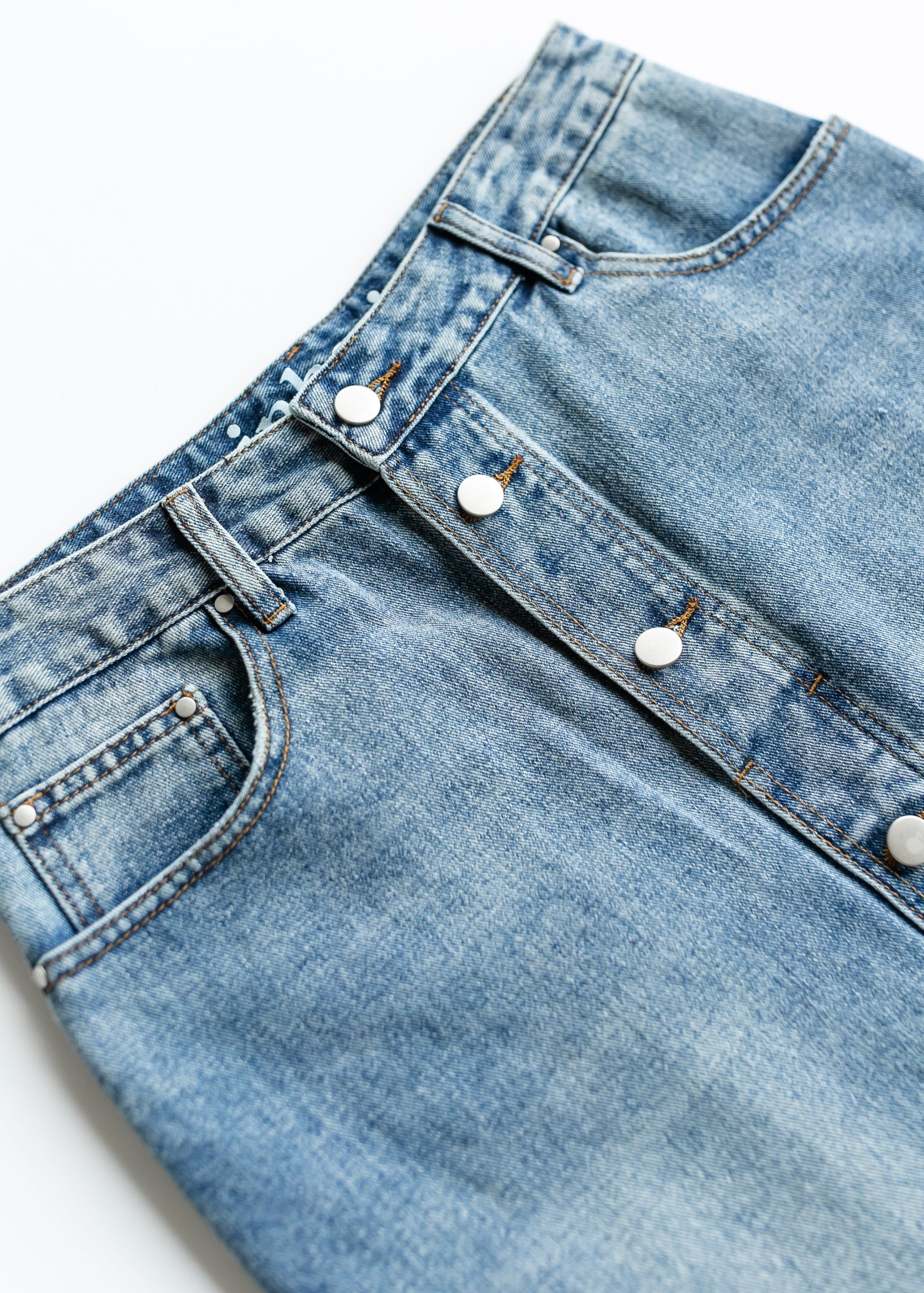 A straight button-front midi denim skirt is a classic staple for every woman’s wardrobe. The pewter buttons are functioning for the first 3 buttons and the rest are sewn in place for modesty - no need to worry about gaps between the buttons! Wear her with a classic button-up, a blouse or a tee - she will make anything look elevated!