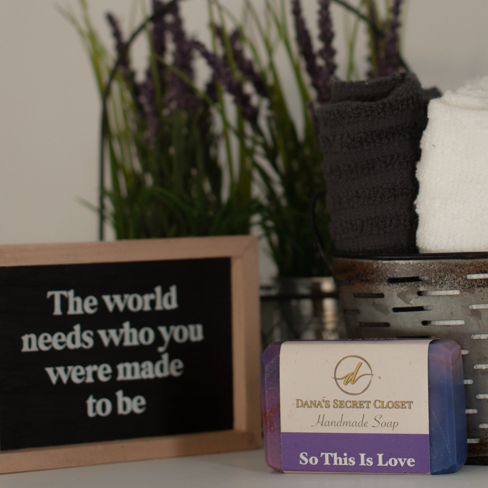 This handmade soap bar, named 'So This Is Love,' features a blend of fruit and floral fragrances, including apple, peach, grapefruit, cherry blossom, and hydrangea. It is crafted using traditional lye methods and shaped as a rectangular bar, weighing approximately 5 to 5.5 ounces. The soap is designed for use in showering or bathing. Due to the handmade nature, variations in color may occur between batches.