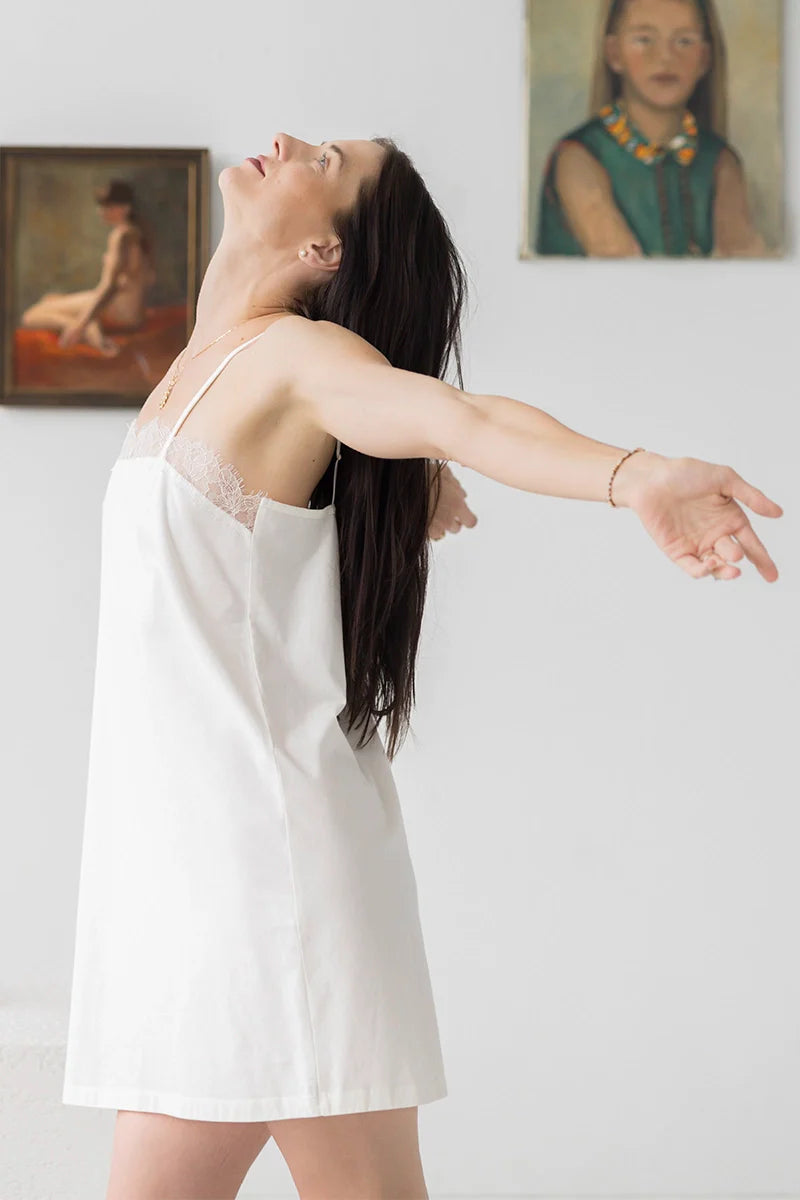 This nightie chemise, crafted from ultra-soft brushed pima cotton, exudes elegance with a minimalist design. The straight neckline is adorned with delicate Japanese eyelash lace, adding a refined, feminine touch to the piece. Cut to drape comfortably over the body, the chemise provides a relaxed fit that feels airy and light against the skin. Finished with slender spaghetti straps, this piece blends luxury with simplicity, making it perfect for a peaceful night’s sleep or lounging in style. This chemise is a timeless addition to any sleepwear collection.