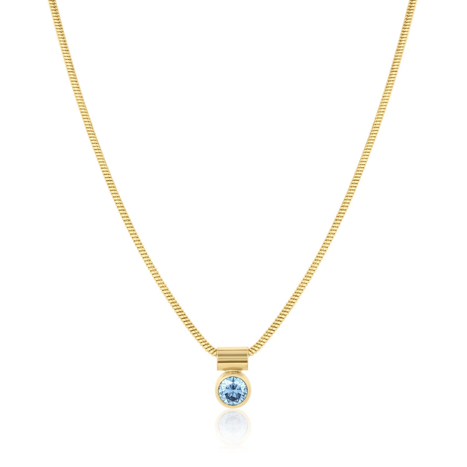 The Something Blue Ellie Necklace features a 4mm round cubic zirconia charm set in 14k gold-filled bezel. It hangs on an 18 inch snake chain plated with 18k gold over brass and closes with a spring ring clasp. This necklace is designed for individuals seeking a subtle and elegant accessory suitable for daily wear or formal events.