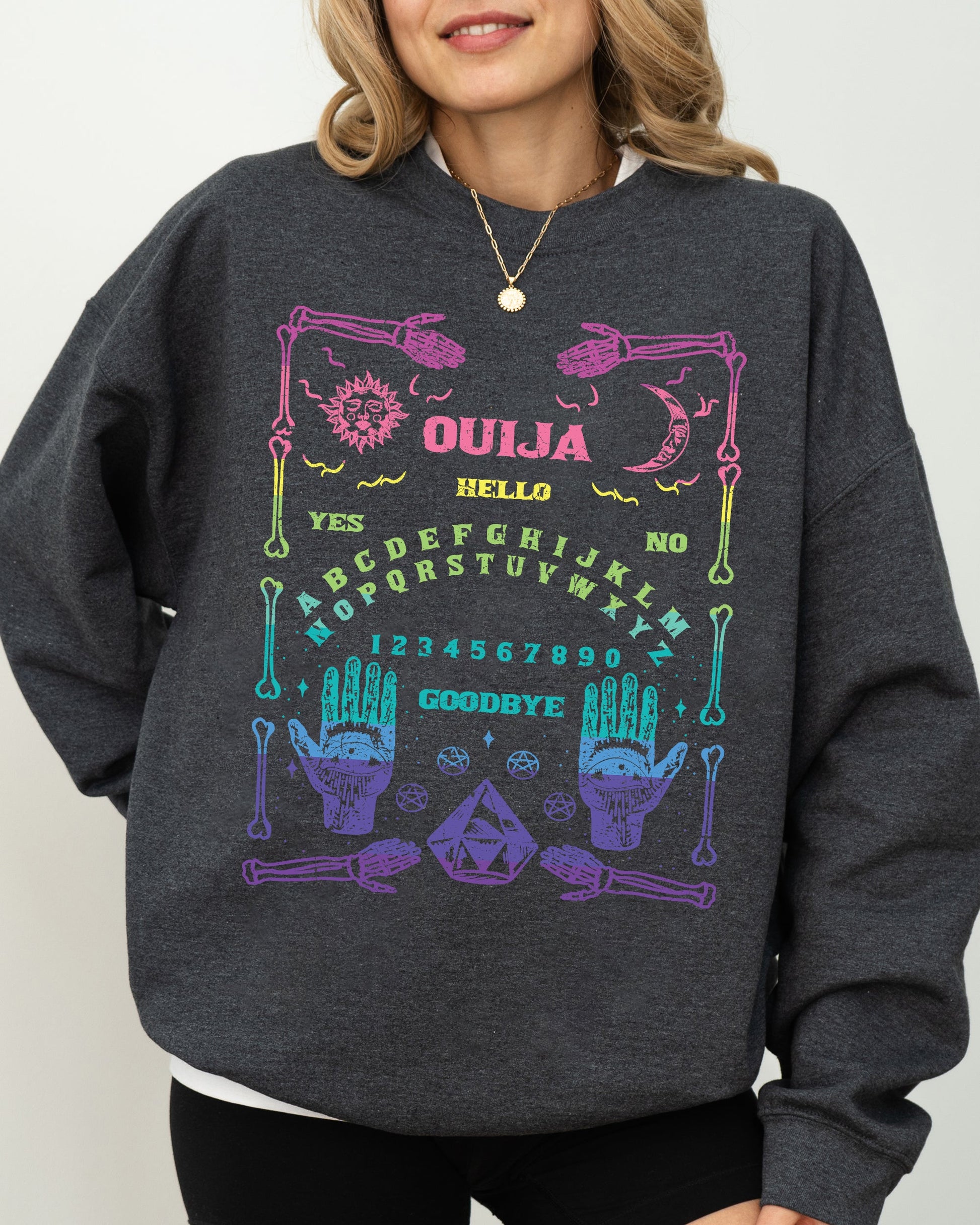 This Spirit Board, Ouija, Skeleton sweatshirt pairs effortlessly with jeans for a laid-back yet trendy look. Layer it over a casual shirt to elevate your style for both spooky gatherings and cozy nights in. Make a statement this Halloween and beyond with this captivating piece that combines fun, comfort, and a dash of the supernatural!