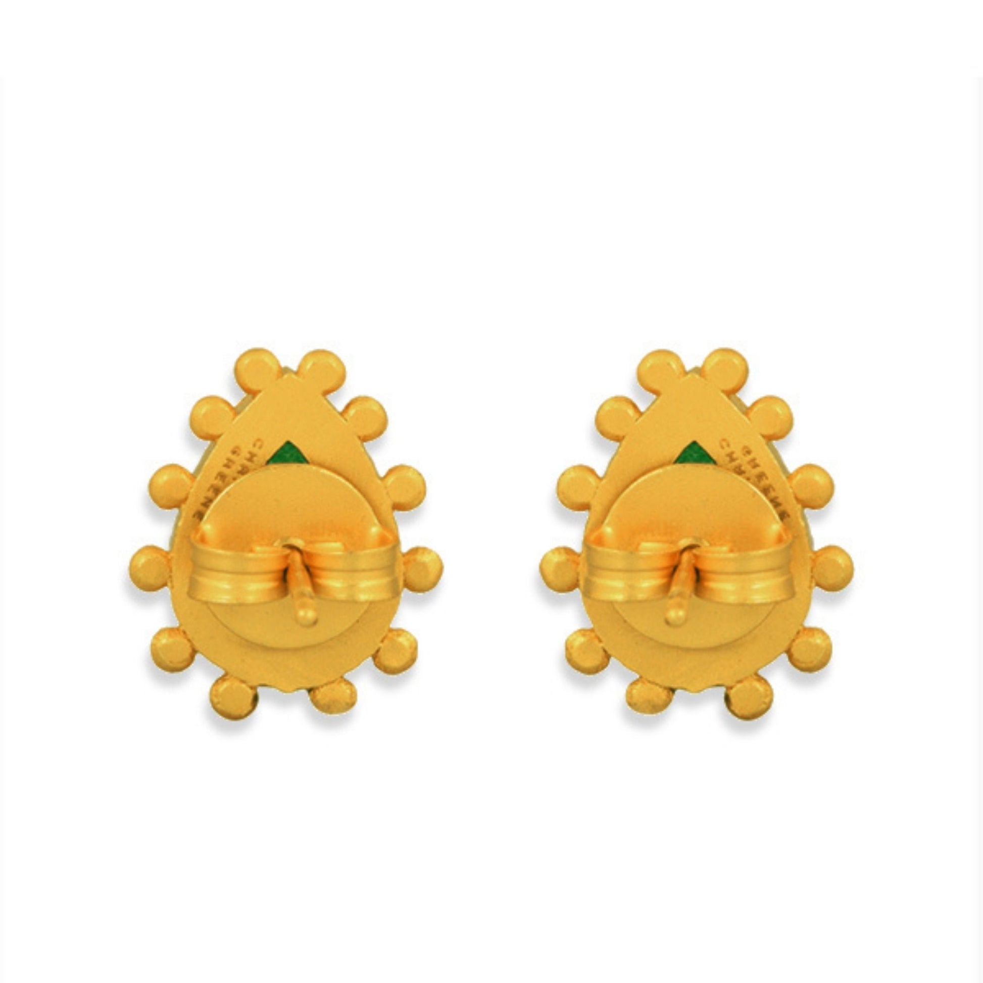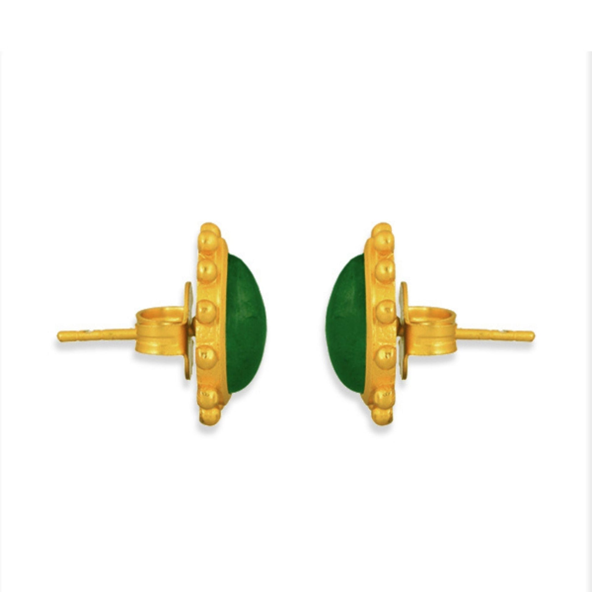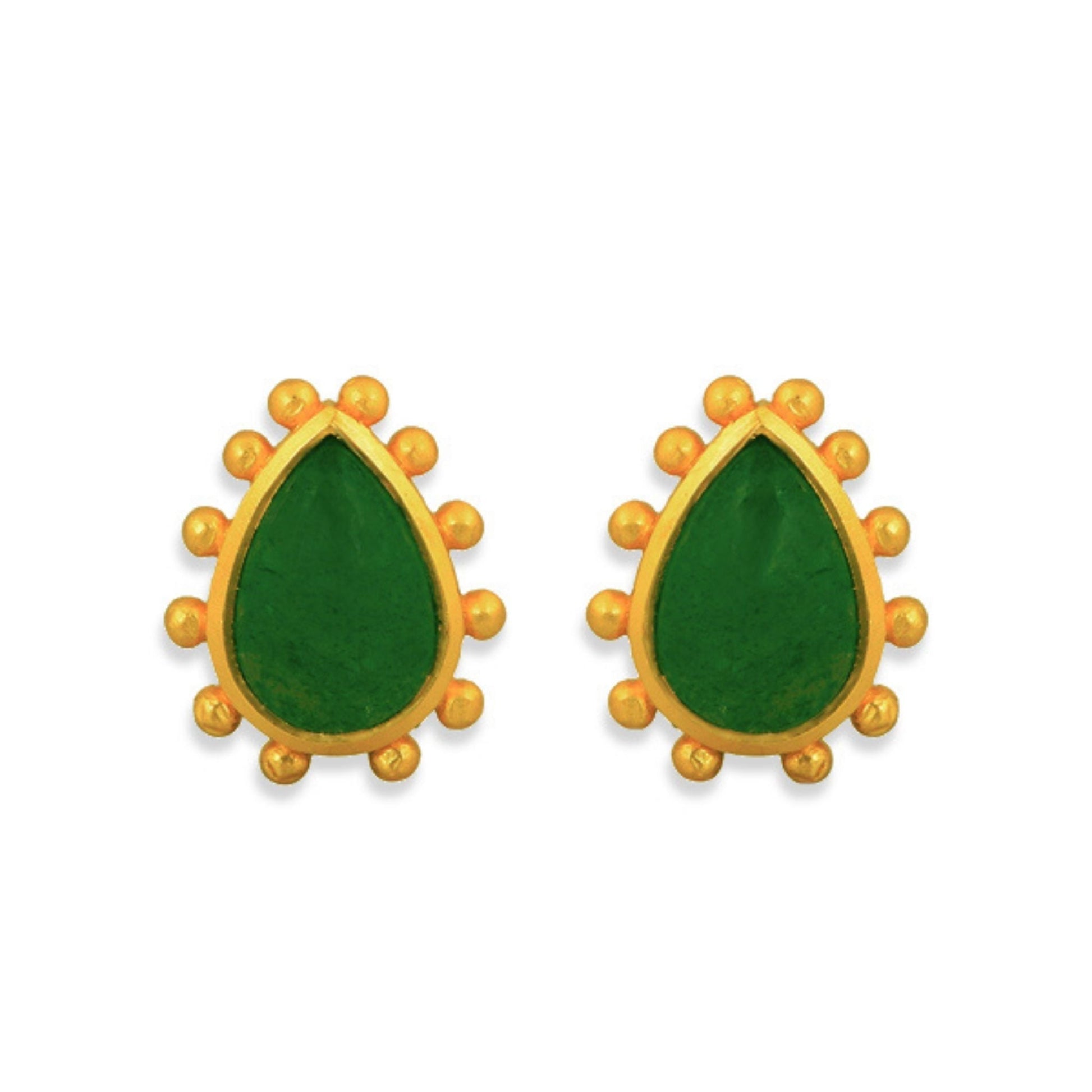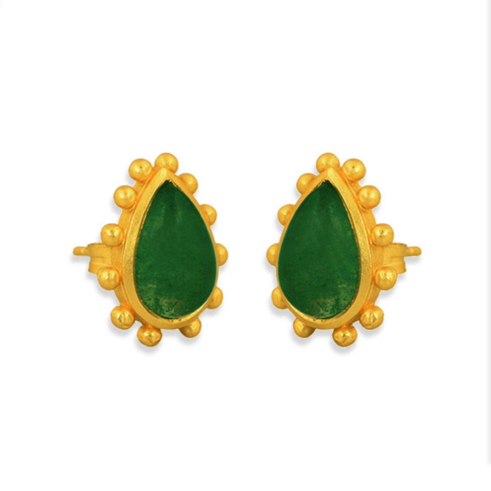 We love an everyday earring that wows, and the Starburst Stud Earrings fit the bill! Featuring a teardrop-shaped green strawberry quartz stone center, and set in 18K gold-plated brass, this simple earring is a statement maker. Studded accents adorn the outer gold setting for a gorgeous detail. Secure these green strawberry quartz earrings with the post-back for easy wear. Want to add to the look? Style these stud earrings with the matching Starburst Cuff or North Star Ring as a finishing touch.