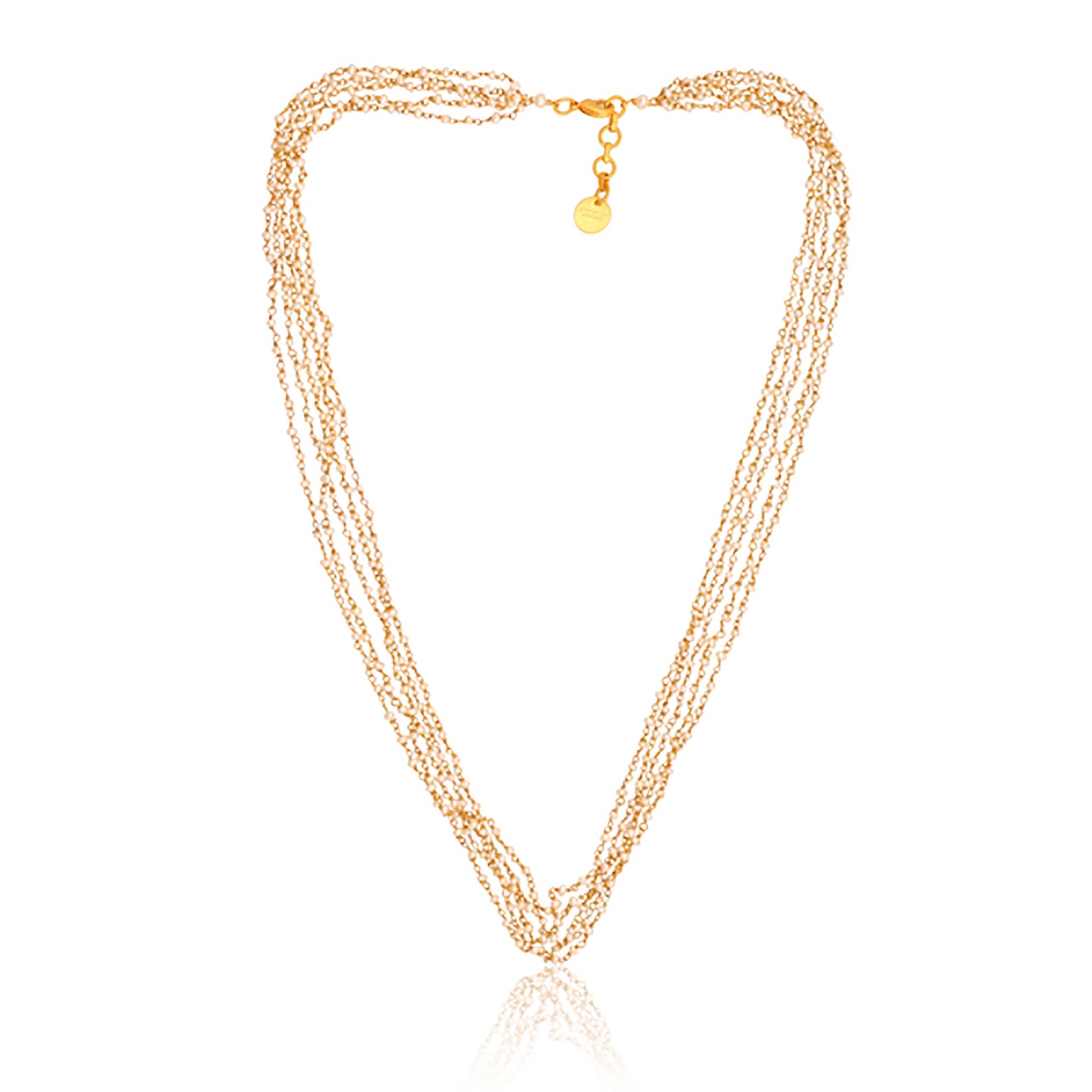 Glamour day or night starts with the Stay Golden Collar Necklace. This 18K gold-plated brass necklace features 5 chains adorned by gorgeous pearl beads. Effortlessly style this pearl necklace for daytime with a simple t-shirt or dress, or amp up the drama by pairing it with your favorite strapless or square neck gown for a formal occasion like a wedding or gala.
