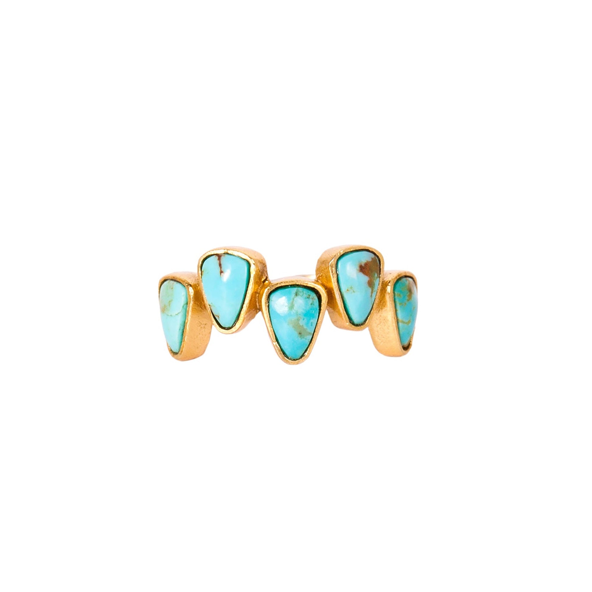 This simple ring band is a great go to ring. Triangular stones are set in a zig-zag pattern to bring interest to this simple style. Add an extra pop to this beautiful turquoise ring when your pair it with our Shandiin Earrings or Turquoise Stud Earrings.