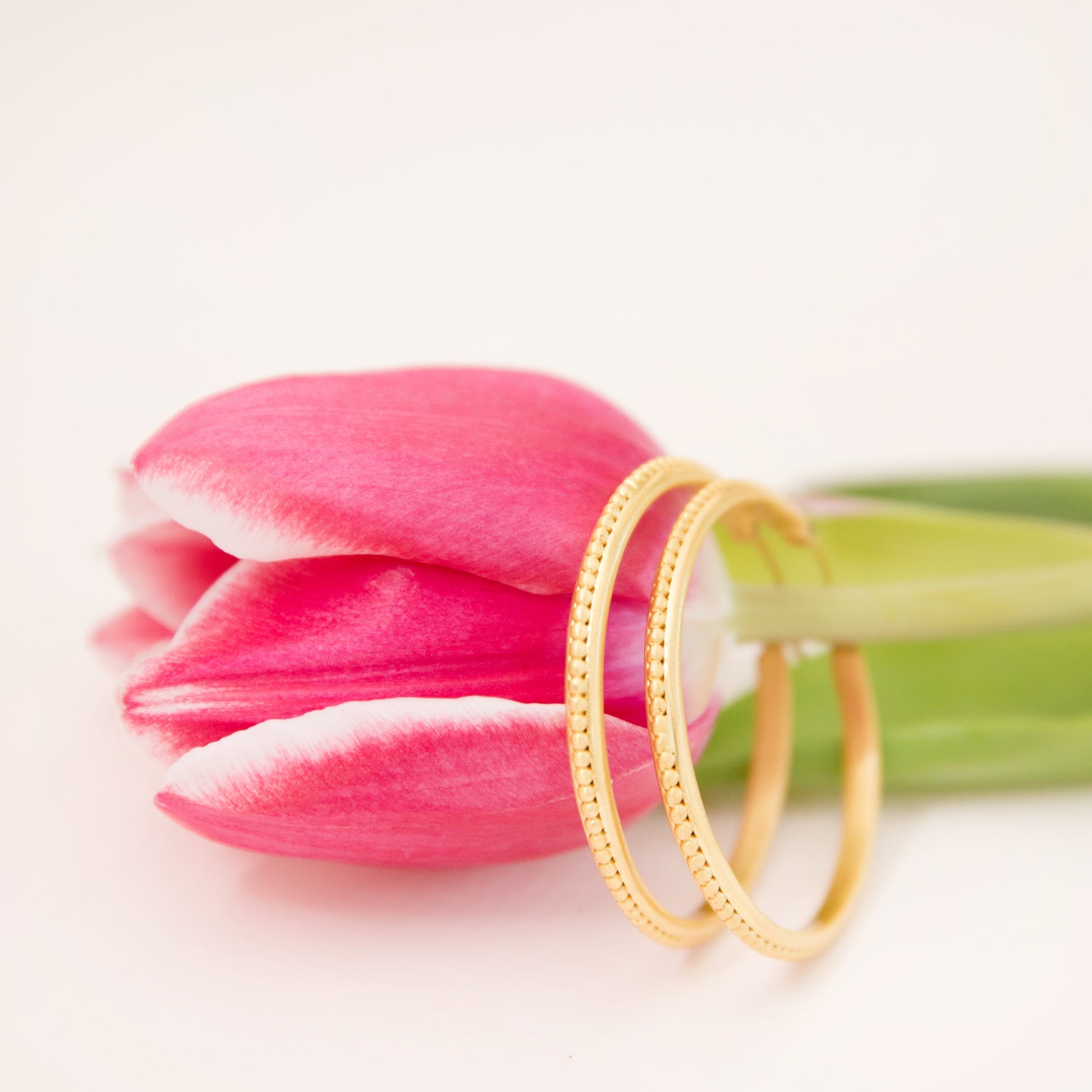 Subtle whimsical details make the Studded Hoop Earring a playful style. These gold hoop earrings feature small ball studs down the center of the earring that add texture and a dressy touch to even the most everyday settings. Designed in brass and plated in 18K gold, these hoop earrings are the perfect blend of timeless and boho style. A catch closure at the back secures these free-spirited gold hoops. Our Cable Bangles are the perfect complement to these gold hoop earrings.