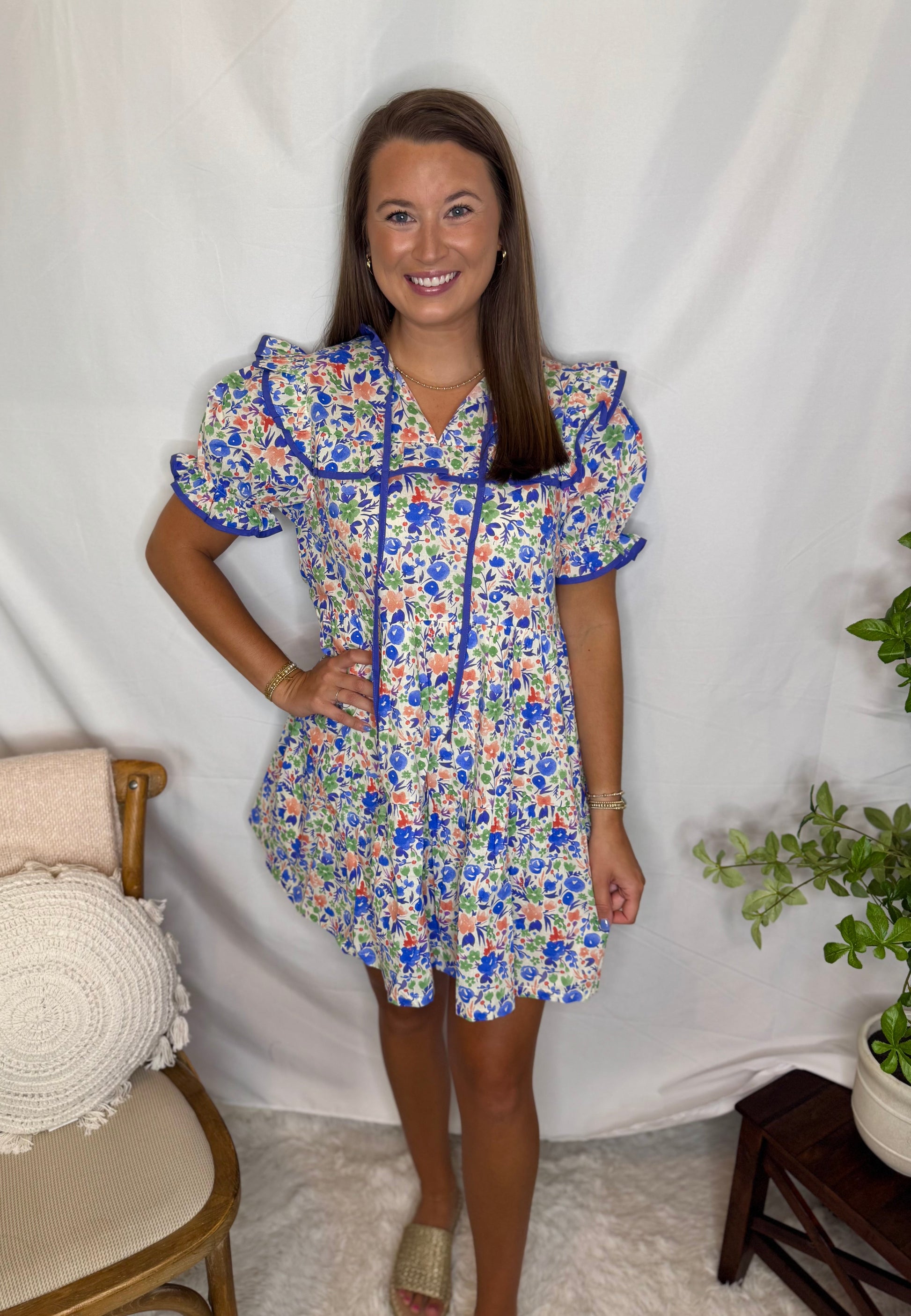 The Garden Party Ruffle Mini Dress features a vibrant floral print with playful ruffle sleeves and blue trim. Designed for women, it is suitable for events such as showers, brunches, or casual summer walks. The model shown is wearing a size medium. It offers a fun and feminine look for various occasions.