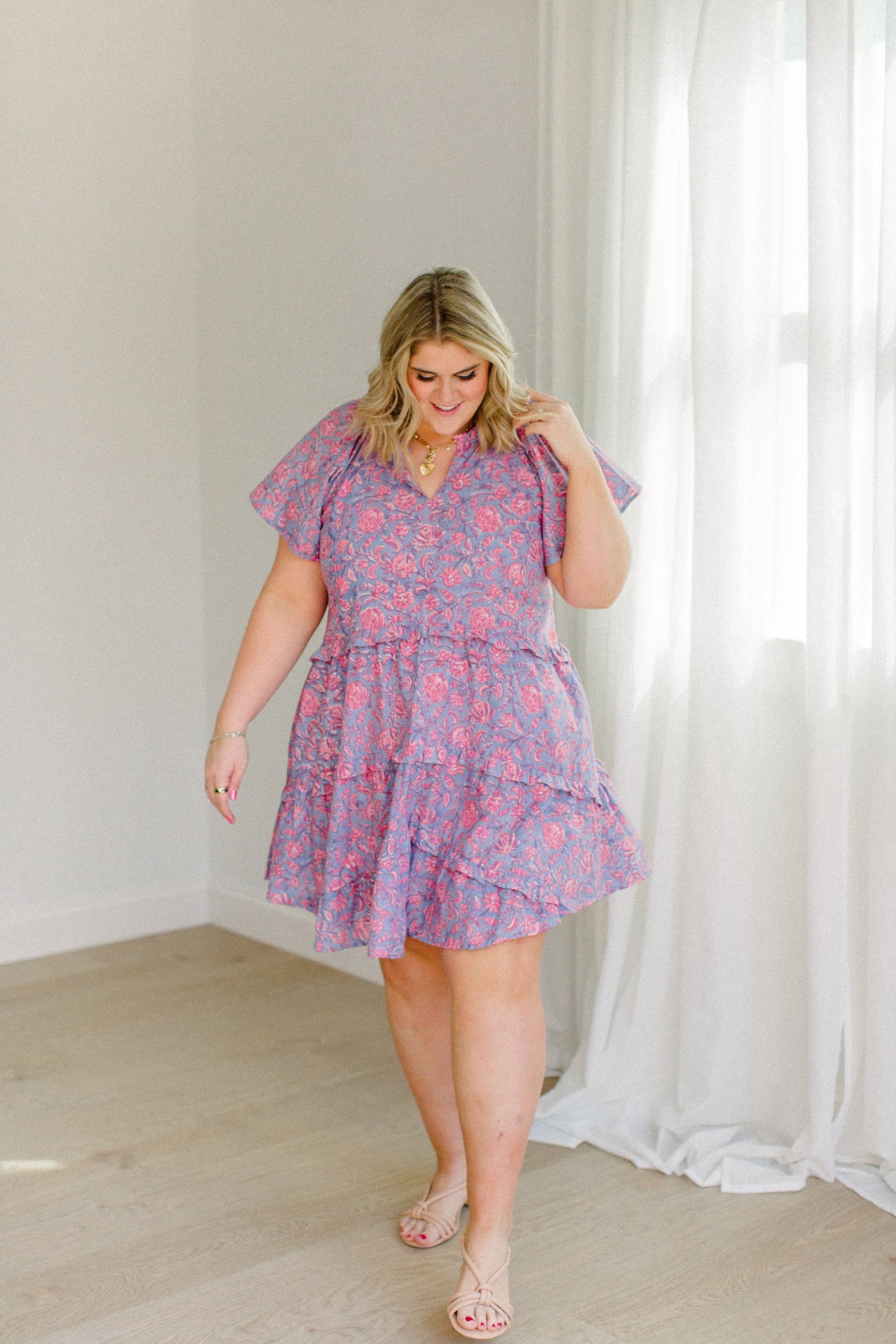 The Kathleen Dress in Orchid Rose is a lightweight, floral a-line dress made from 100% cotton cambric perfect for spring and summer. Designed for comfort, it features a ruffle collar, curved ruffles on the skirt, flowy short sleeves, and functional pockets. Suitable for women looking for a casual yet feminine dress, it is bump friendly and unlined. The dress pairs well with a jacket for cooler days and runs slightly small in the bust, so sizing up is advised for larger busts.