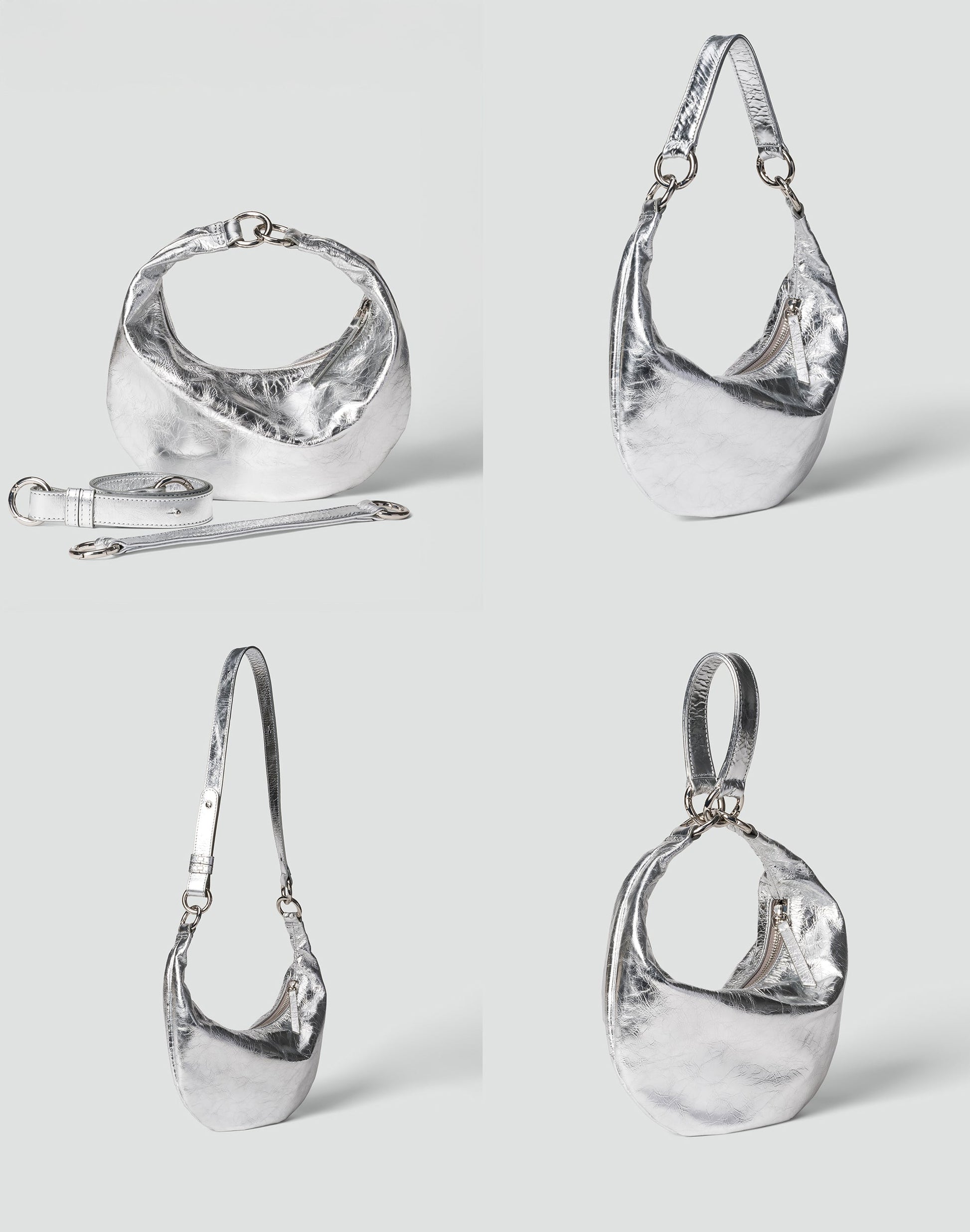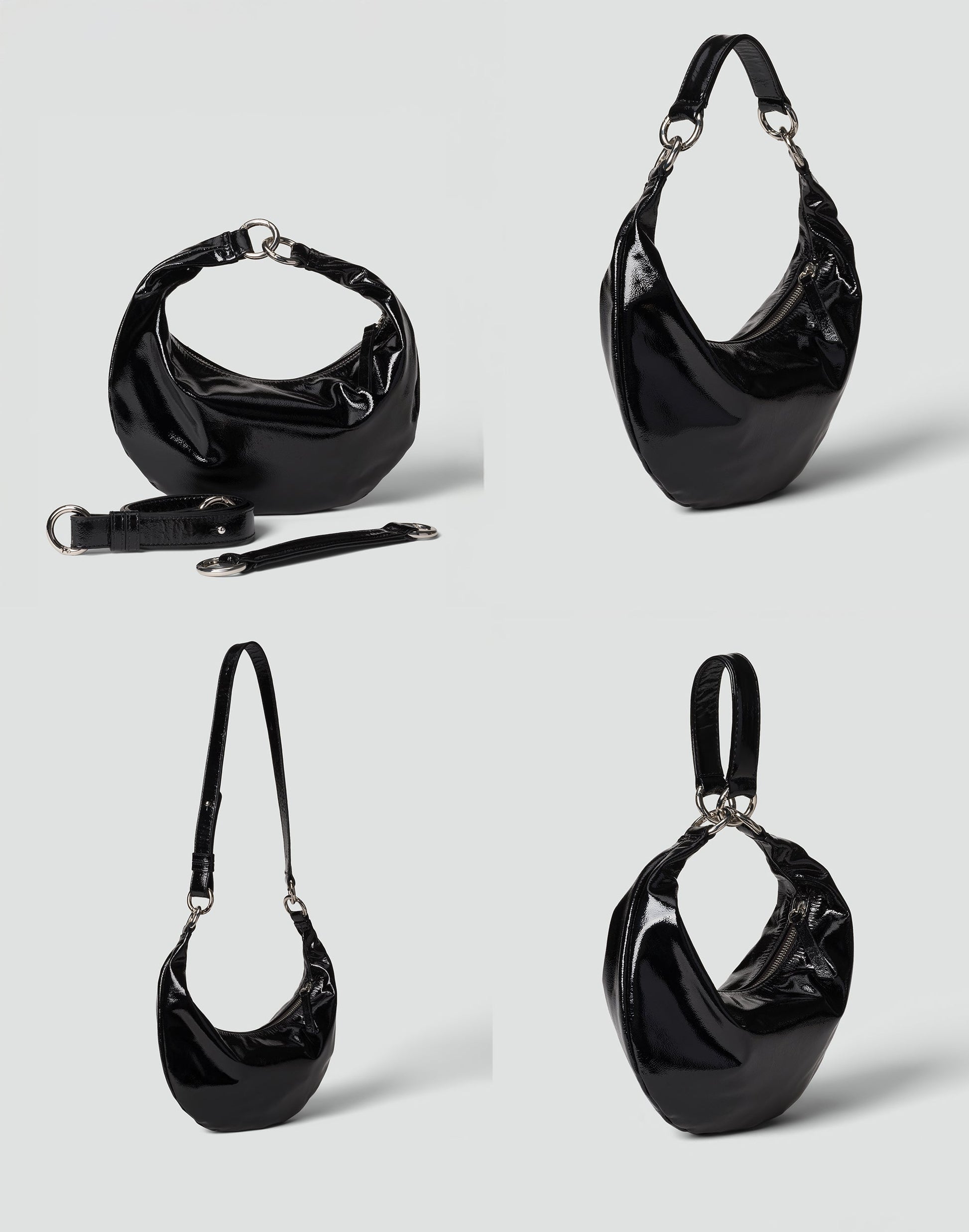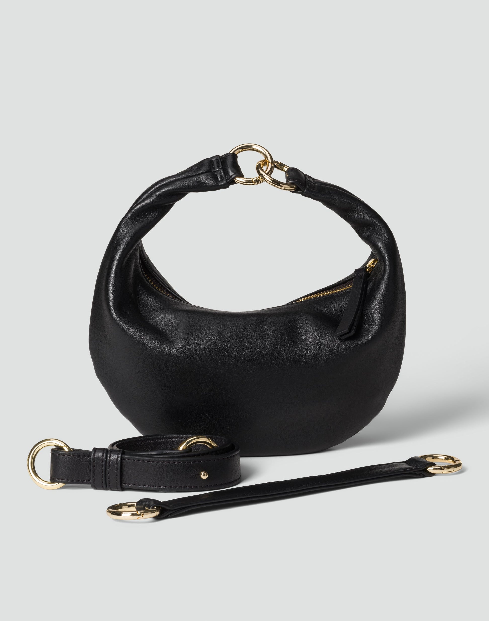 Crafted in the hills of Italy, the Micro Ring Bag is everything you love about our best-selling everyday Ring Bag, made into a mini size. Fitting a phone, camera, keys, gloss and everything you need for a trip or a night out, the Micro Ring can be worn 4 different ways. Featuring a unique click-ring mechanism and two adjustable straps, you can effortlessly switch from a chic handheld hobo to wristlet to a curved shoulder bag or a crossbody crescent bag with a quick click.