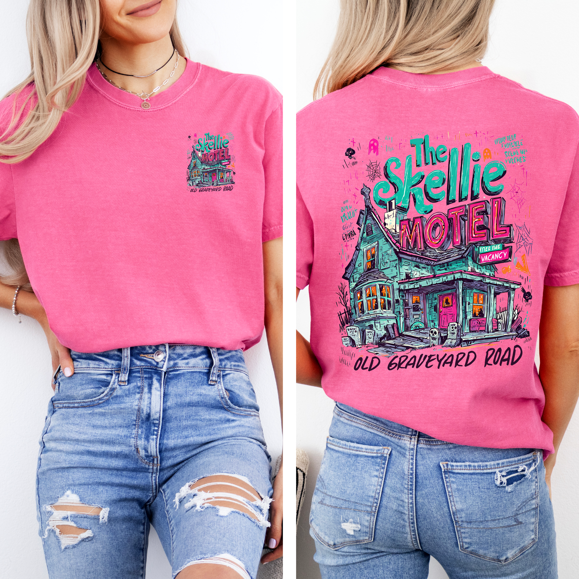 Embrace spooky-cute style this season and make every Halloween moment memorable with The Skellie Motel tee. Add to cart now and wear your Halloween story on your sleeve.
