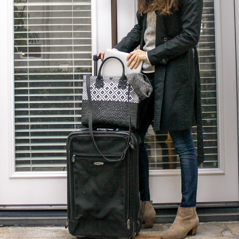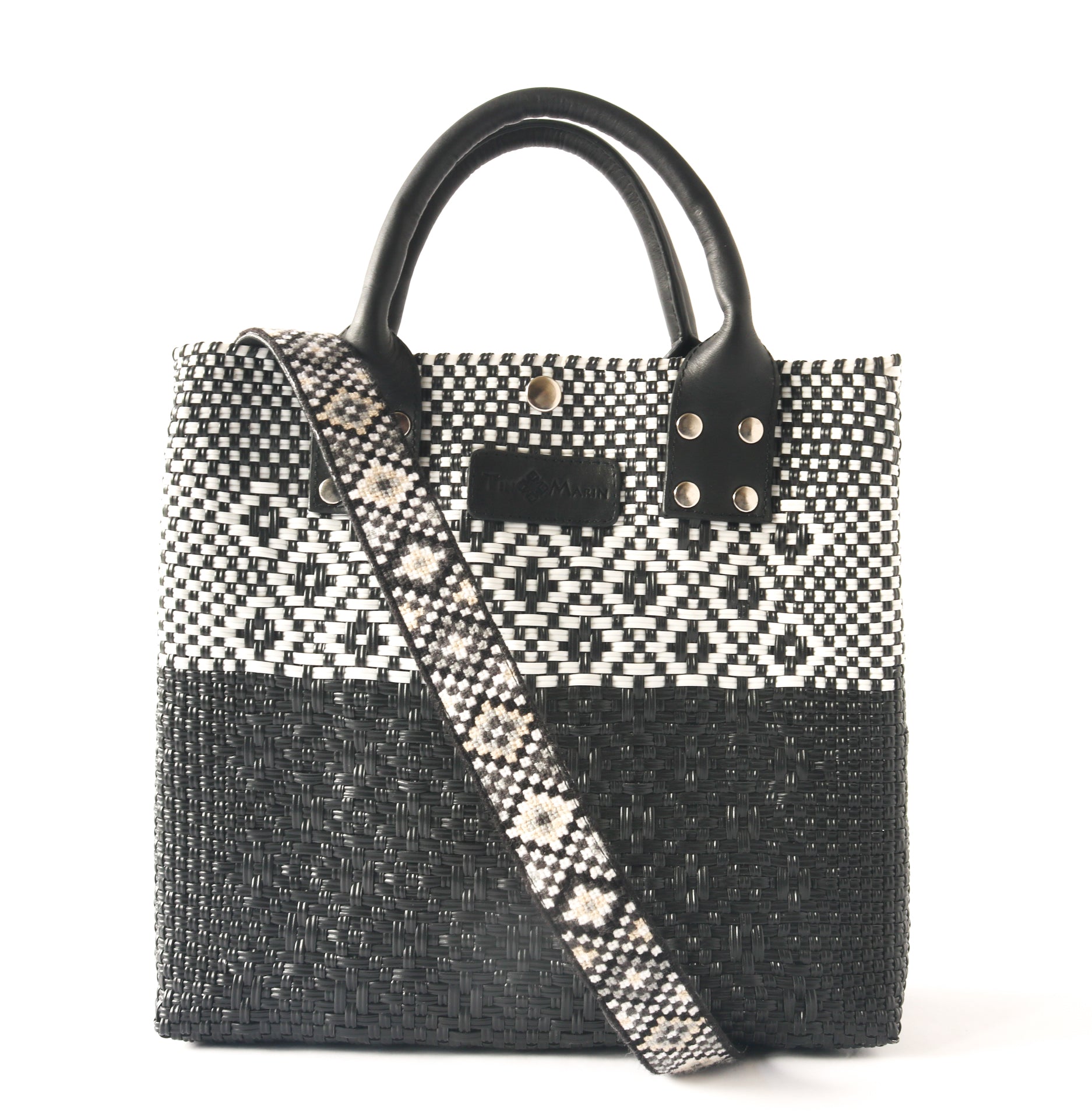 The Large Black Woven Crossbody Bag by Tin Marin is a handmade accessory combining recycled plastic and genuine cowhide leather. It fits essentials like a 13” laptop, tablet, notebook, water bottle, wallet, and keys. Designed for people needing a versatile daily bag, it has an adjustable strap for style flexibility and is both durable and lightweight. Perfect for work, travel, gym, or everyday use.