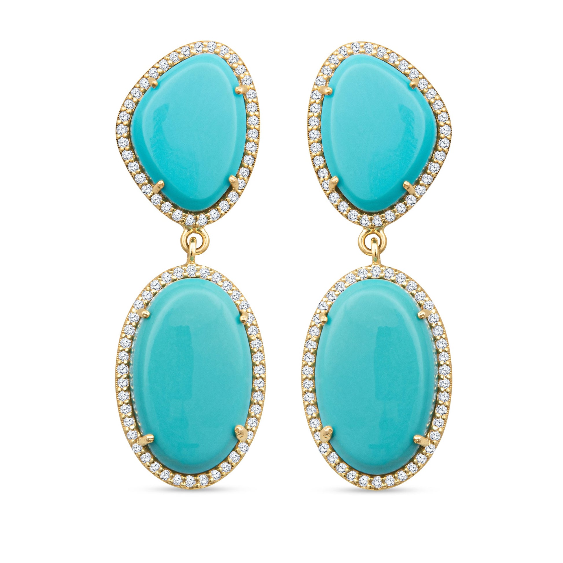 Bold yet refined, this stunning drop earring will add a pop to your fine jewelry collection. The Tina statement earrings feature two polished turquoise stones surrounded by white diamonds, have post back closures, and are set in 14K gold. Showcasing a total of 150 pave diamonds, these refined turquoise earrings will elevate your favorite everyday looks and complement your favorite formal styles. Originally designed and worn by our founder, Christina, for her rehearsal dinner, these turquoise and diamond earrings hold a special place in our hearts. These turquoise statement earrings are the perfect gift for those who make elegant seem effortless.