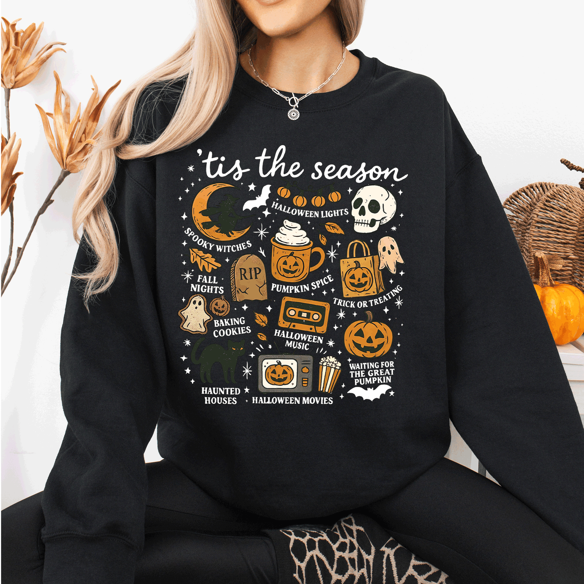 Tis The Season, Halloween, Skeleton, Black Cat, Witch, Ghost, Pumpkin Sweatshirt