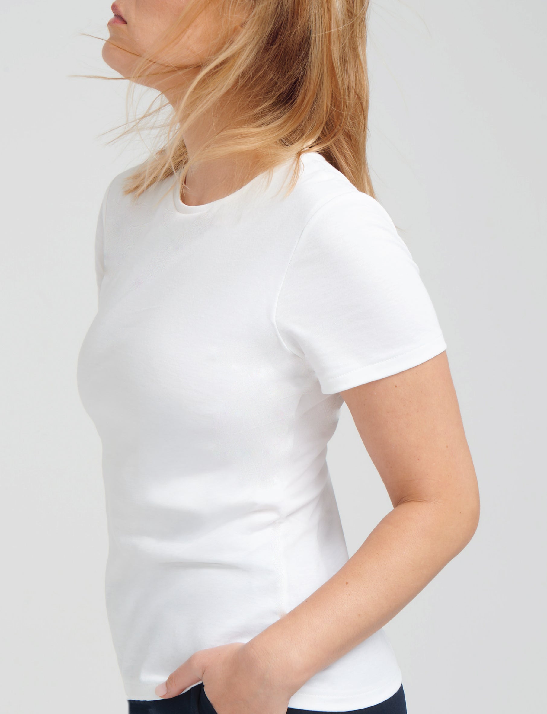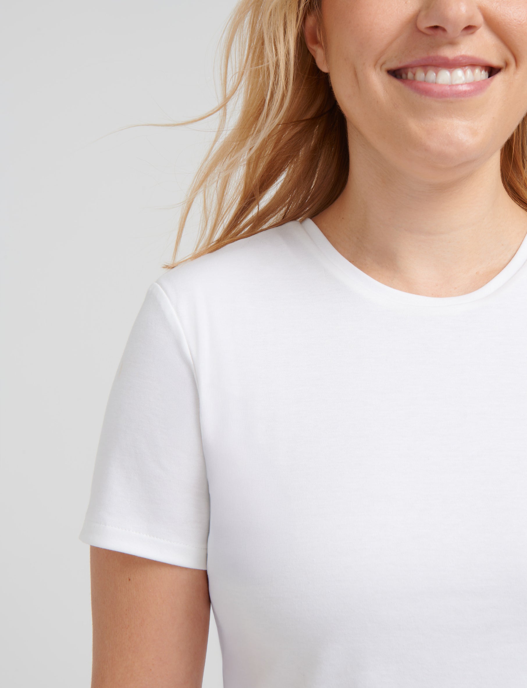 A luxuriously soft white jewel-neck tee with a built-in, feather-light support bra that disappears against the skin. Made from premium interlock Supima® cotton that’s breathable, never stiff, and stays bright wash after wash. No bands, no straps—just effortless comfort and clean lines.