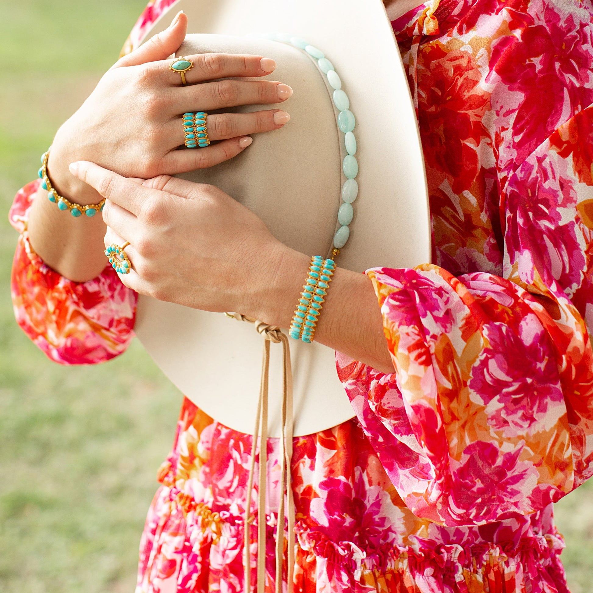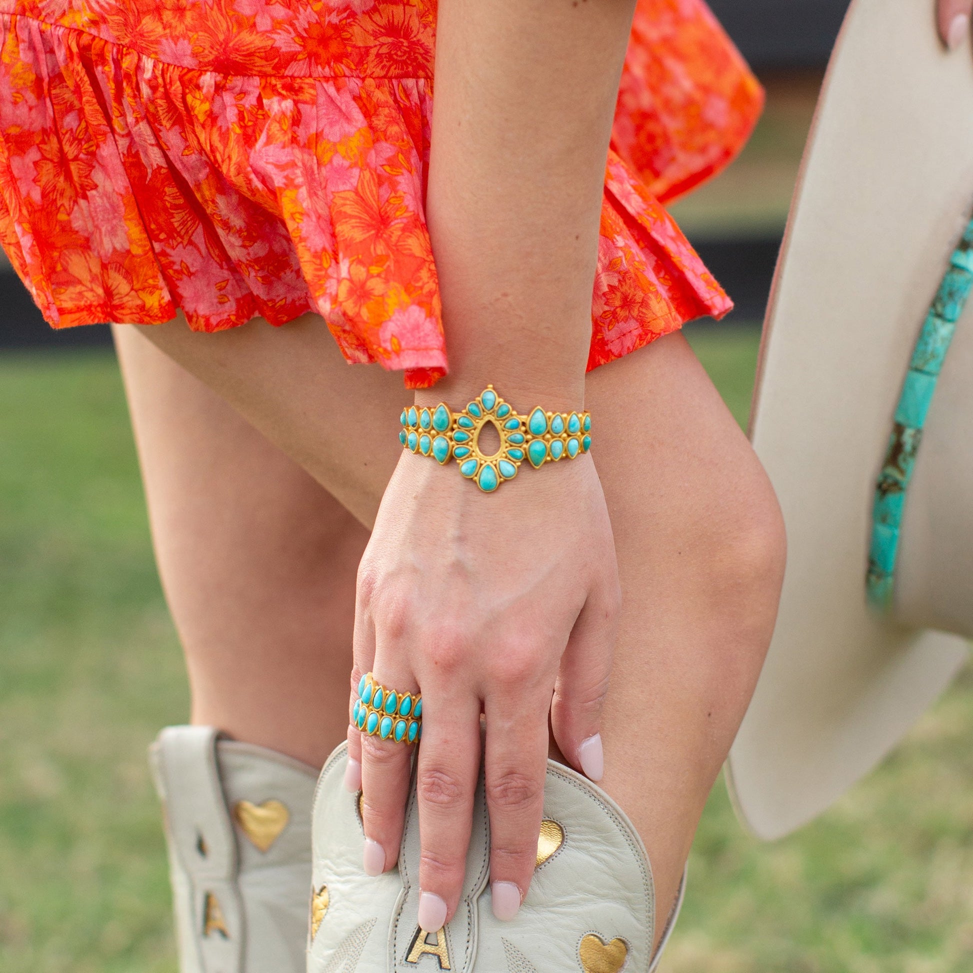 We love a timeless statement piece and the Tucson Eternity Ring is it! This eternity ring features two reflecting rows of teardrop-shaped turquoise stones. Set into our signature 18K gold-plated brass for hypoallergenic wear, this eternity band is available in several sizes to ensure a true eternity look. Find your perfect fit and then pair this ring with the matching Tucson Cuff or Dreamcatcher Drop Earrings for a complete styling.