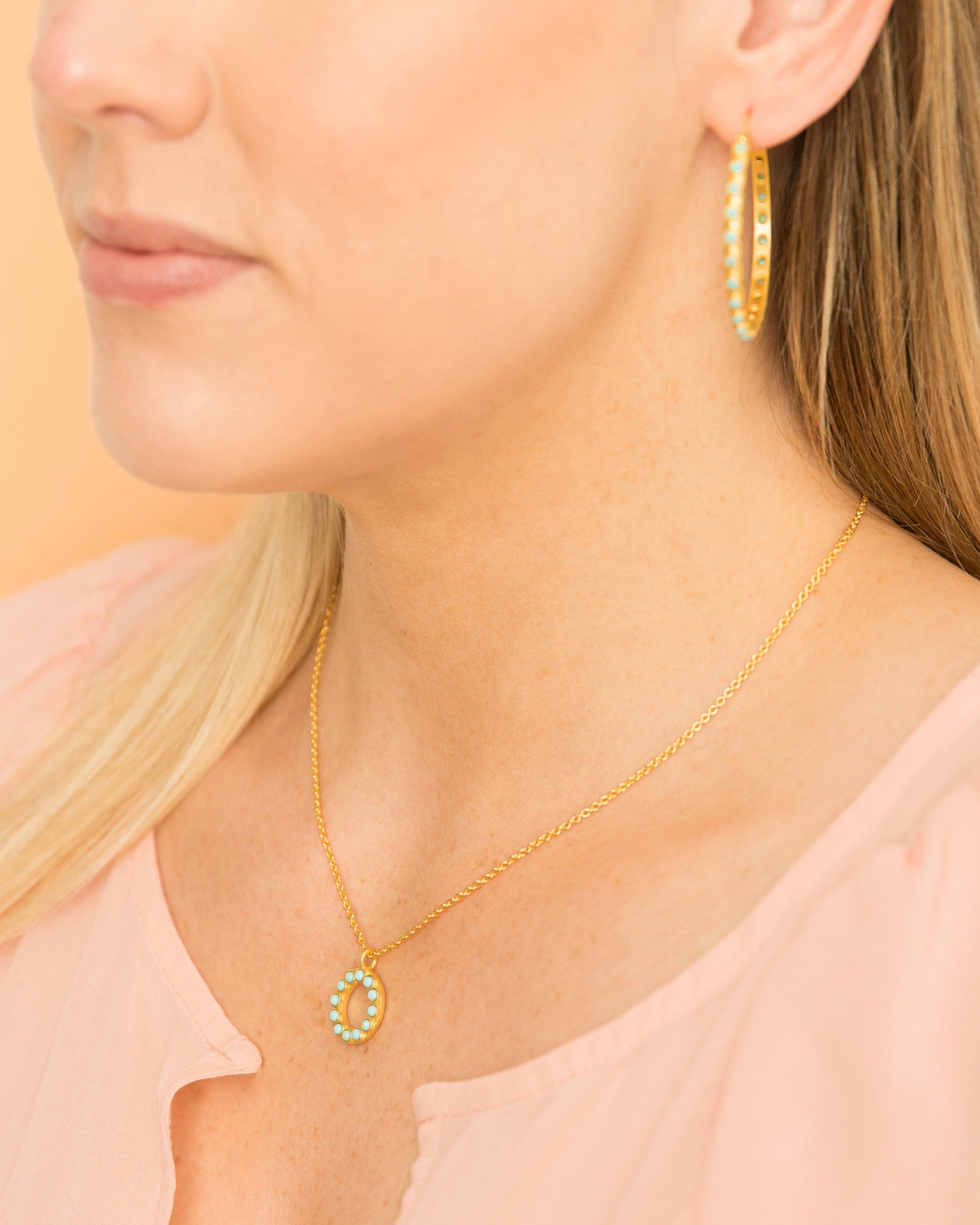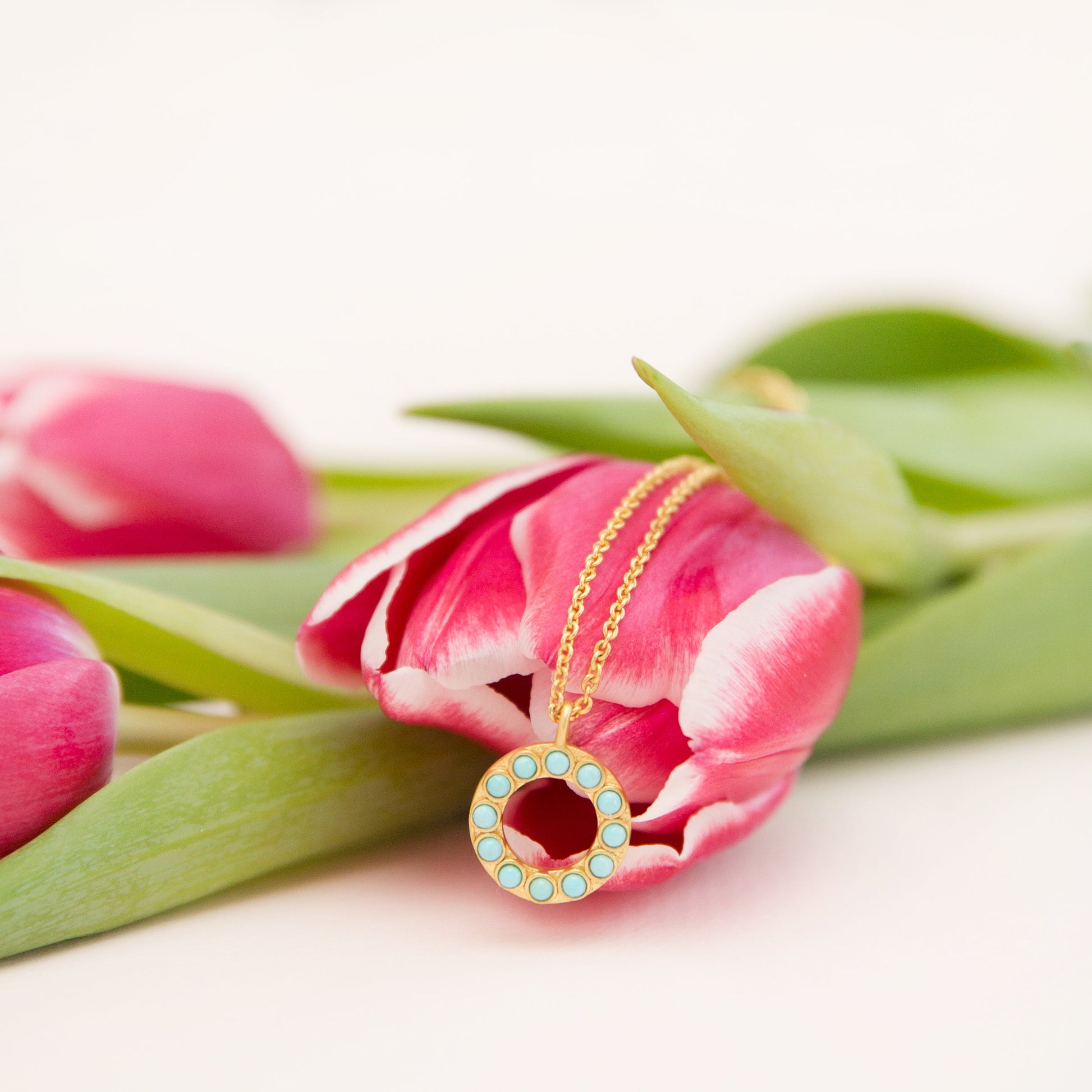 Let this circle pendant necklace with turquoise stones remind you to find beauty in the little moments of your day as you wear it. This gold necklace features a 16-inch chain that connects at a circular pendant encrusted with round turquoise stones. The circle pendant and chain are brushed in 18K gold plating over brass for a unique textured look. Wear the necklace short or extend it as you please using the 2-inch extender chain to create your own unique styling. Paired up with our Full Circle Bangle in Turquoise, our Full Circle Pendant Necklace will be your favorite everyday look.