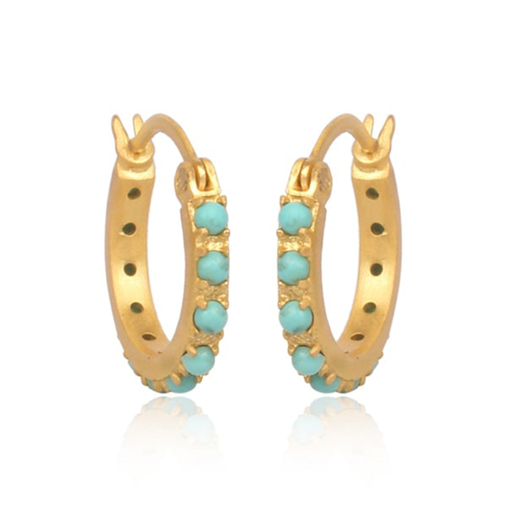 A little goes a long way with our Turquoise Huggies. These huggies are designed in brass and brushed in 18K gold plating. Adorned with round turquoise stones in dramatic prong settings, these small hoop earrings add a pop of color, without overtaking an outfit. Team these turquoise earrings with our matching Dainty Pendant Necklace for the perfect everyday jewelry combination.