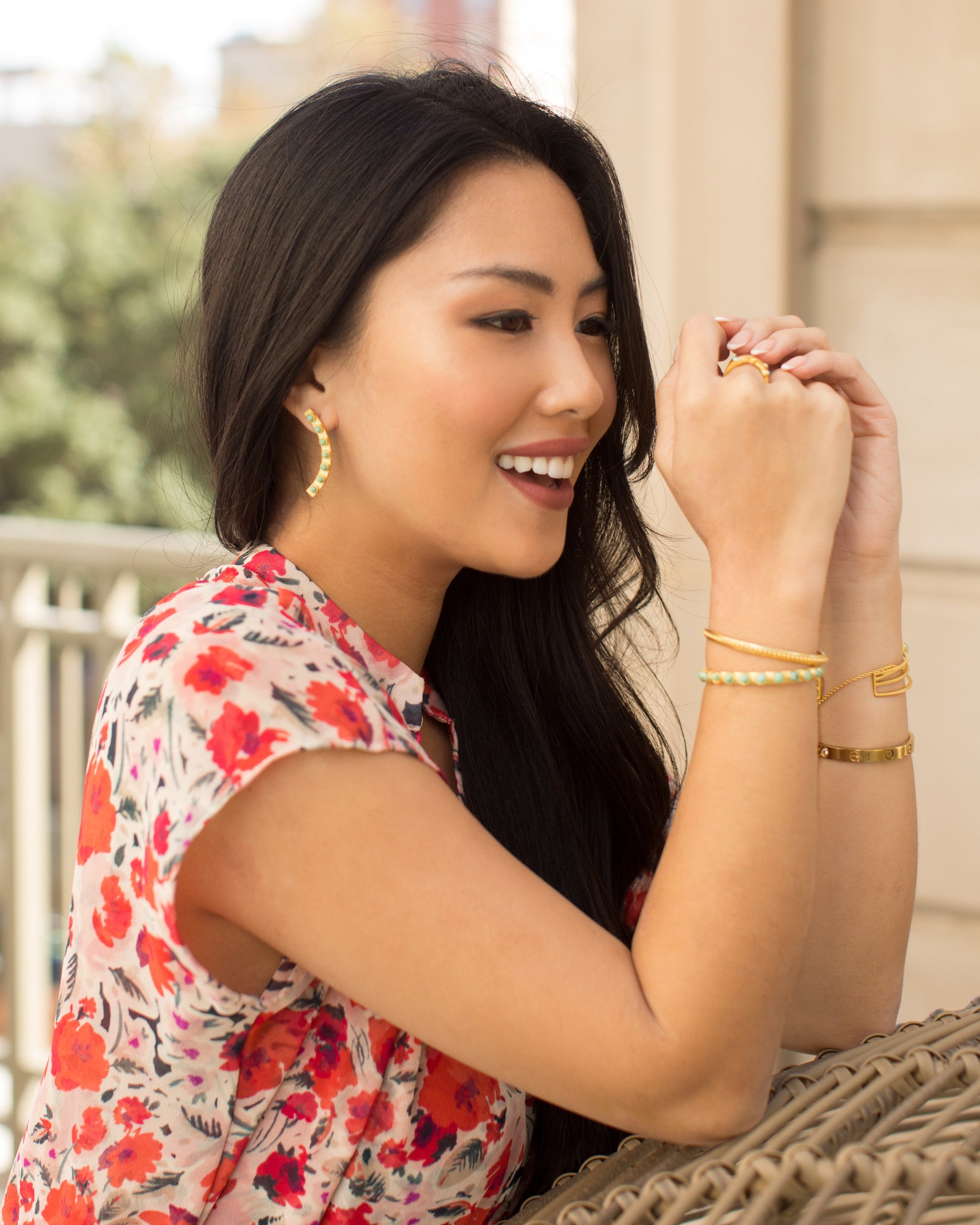 Encircle your wrist in the Turquoise Studded Cuff and channel the serenity that turquoise brings. This gold bangle features 24 round turquoise stones in bezel settings. Designed from brass and plated in brushed 18K gold, this cuff is adjustable for easy wear. Worn in tandem with our Turquoise Pendant Necklace or Turquoise Circle Hoop Earrings, or mixed in with your favorite bangles and cuffs, this turquoise bracelet will ground your look.