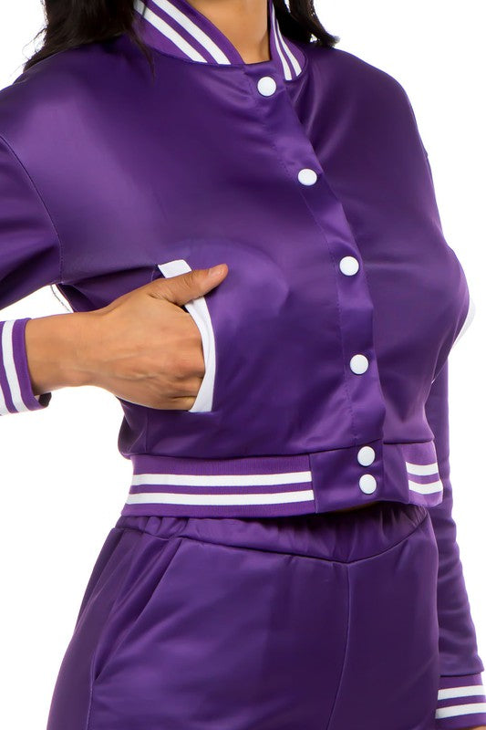 Sexy bomber jacket, front button, long sleeves, side pocket sexy look , elasticized waist pant