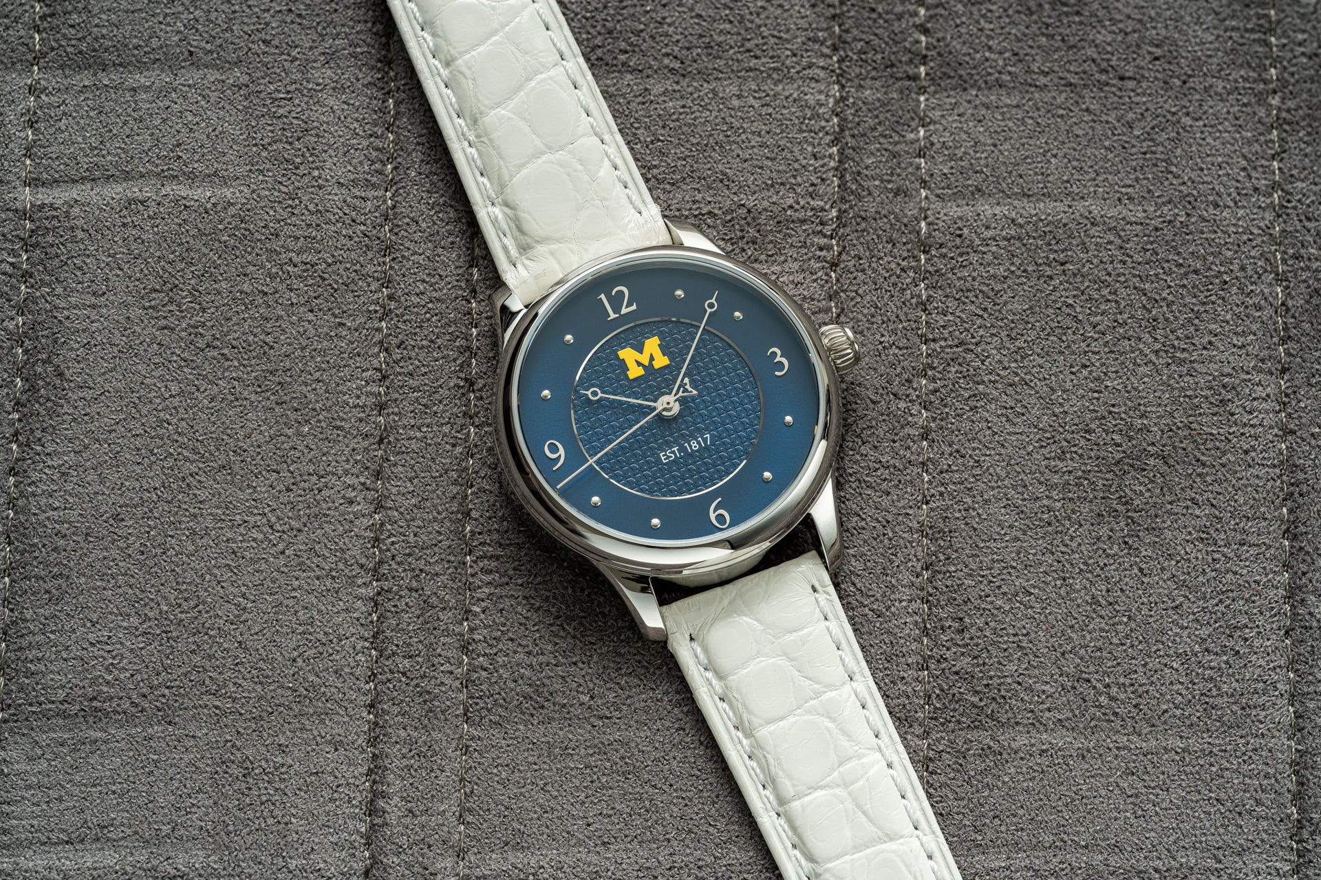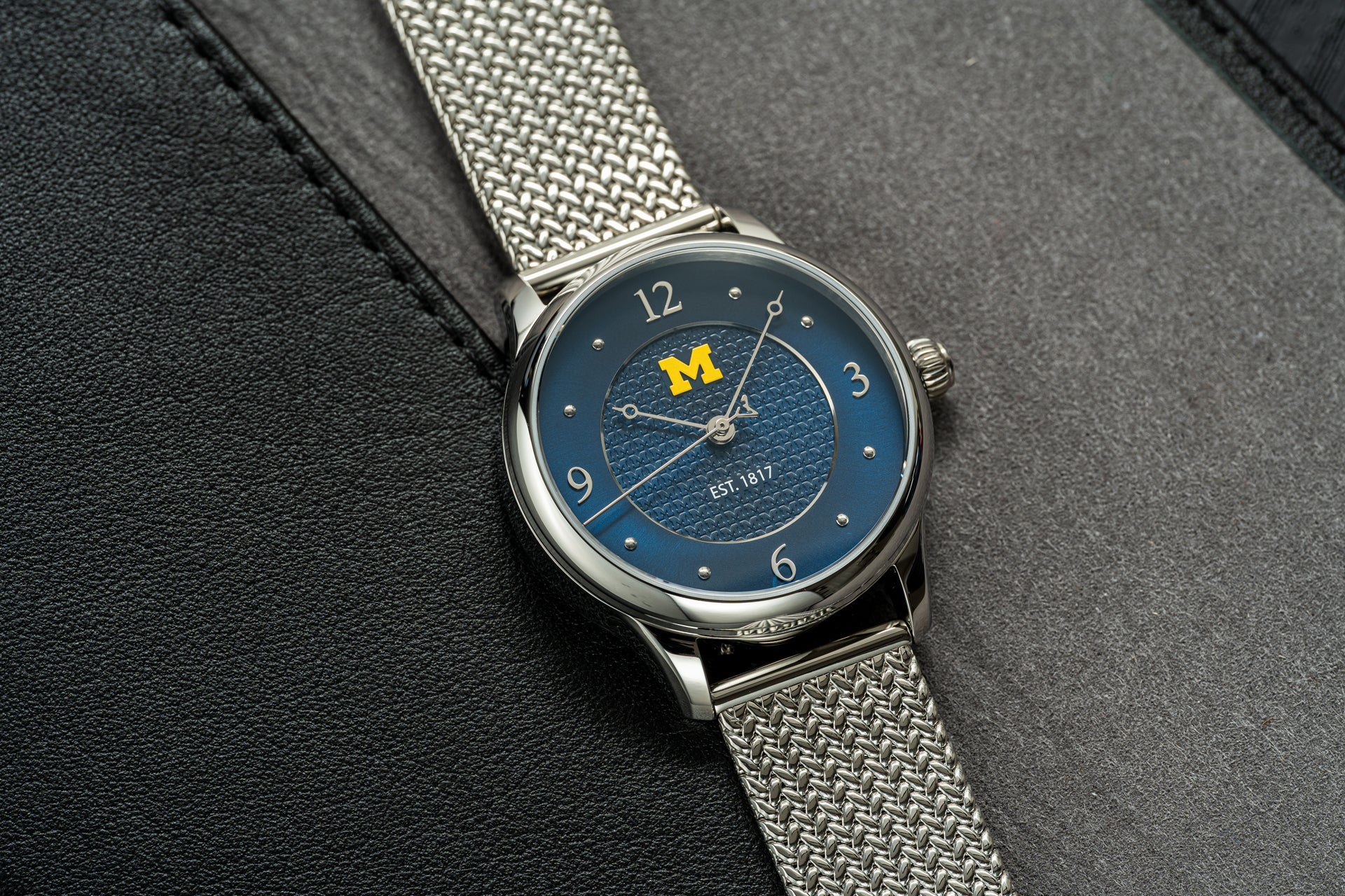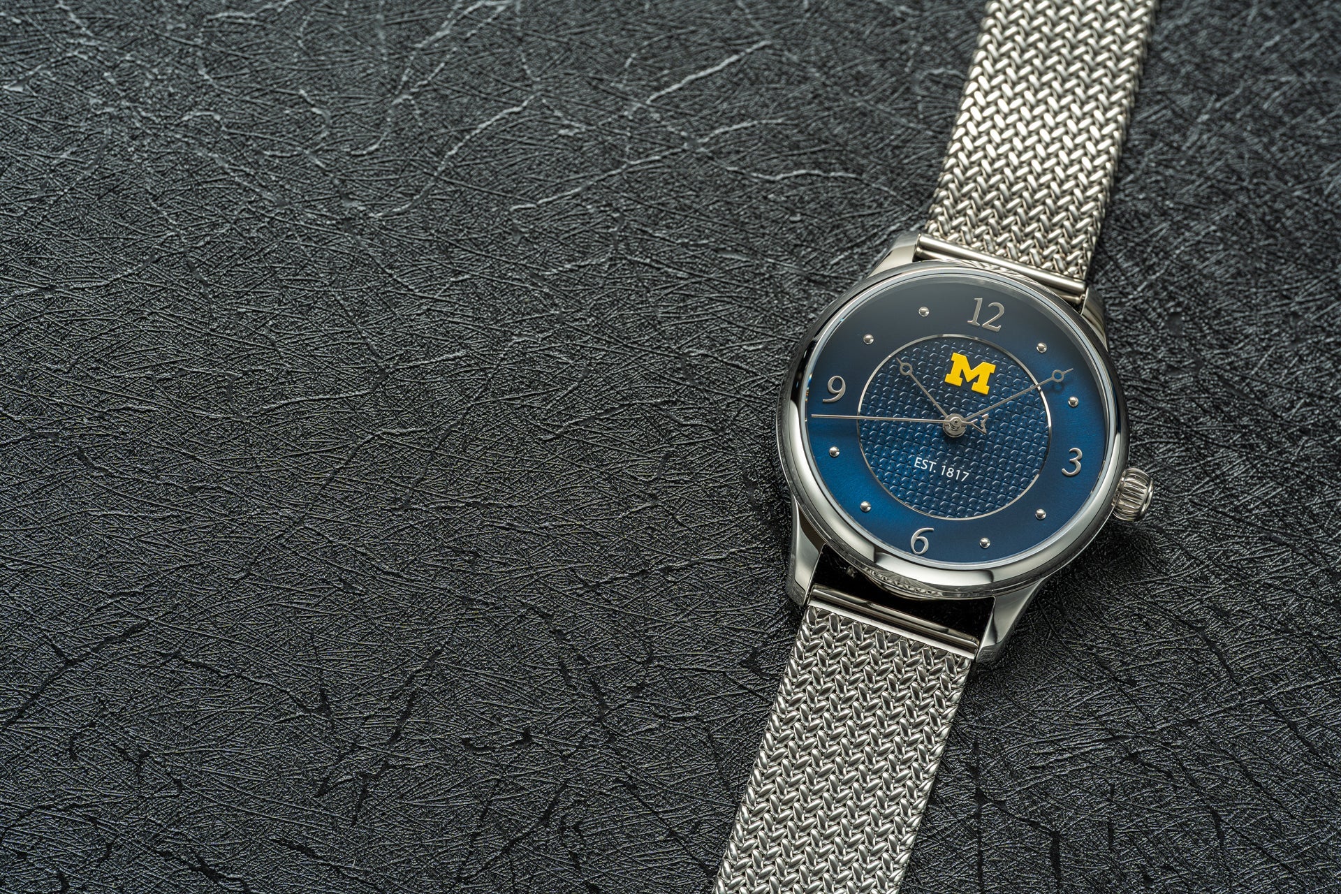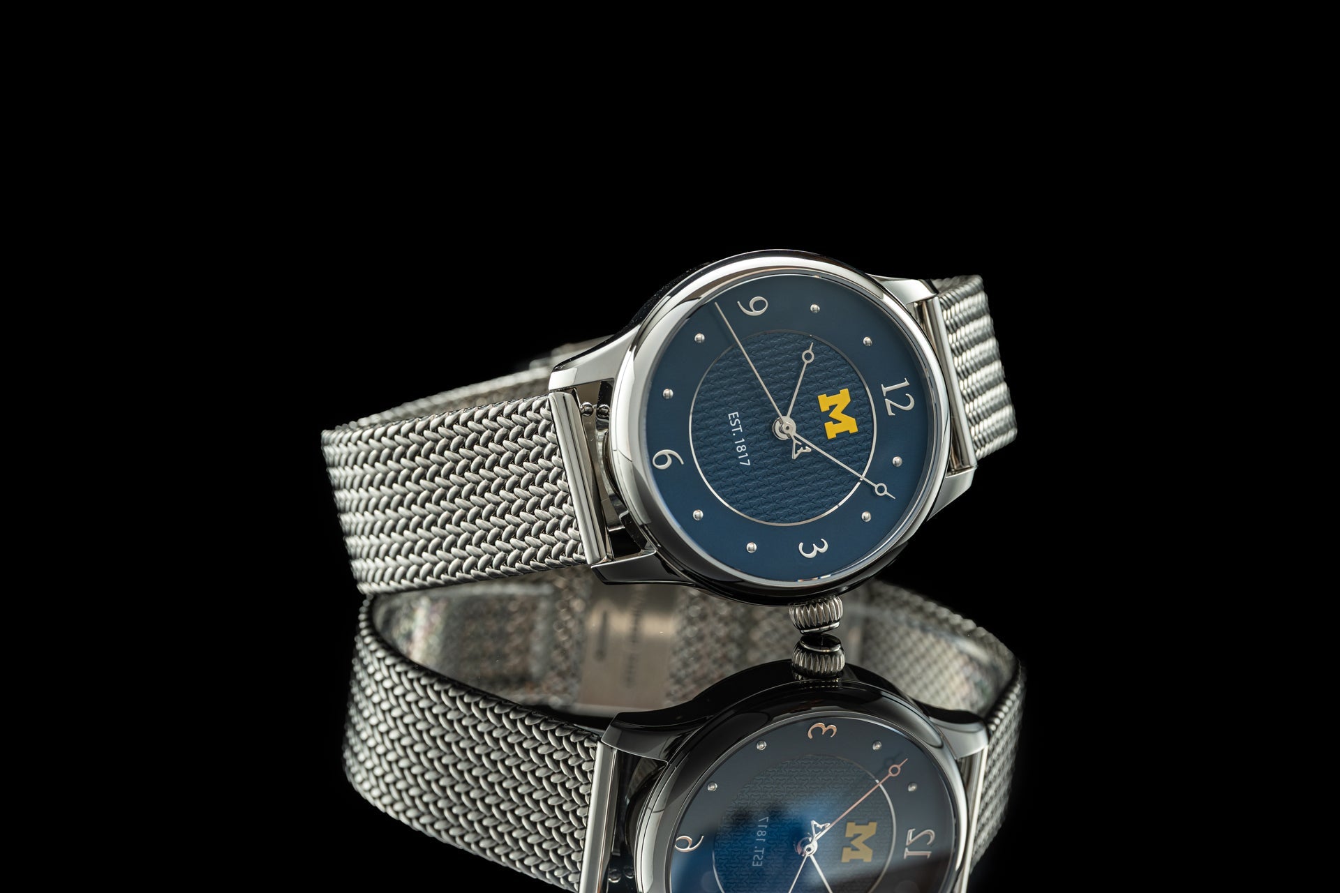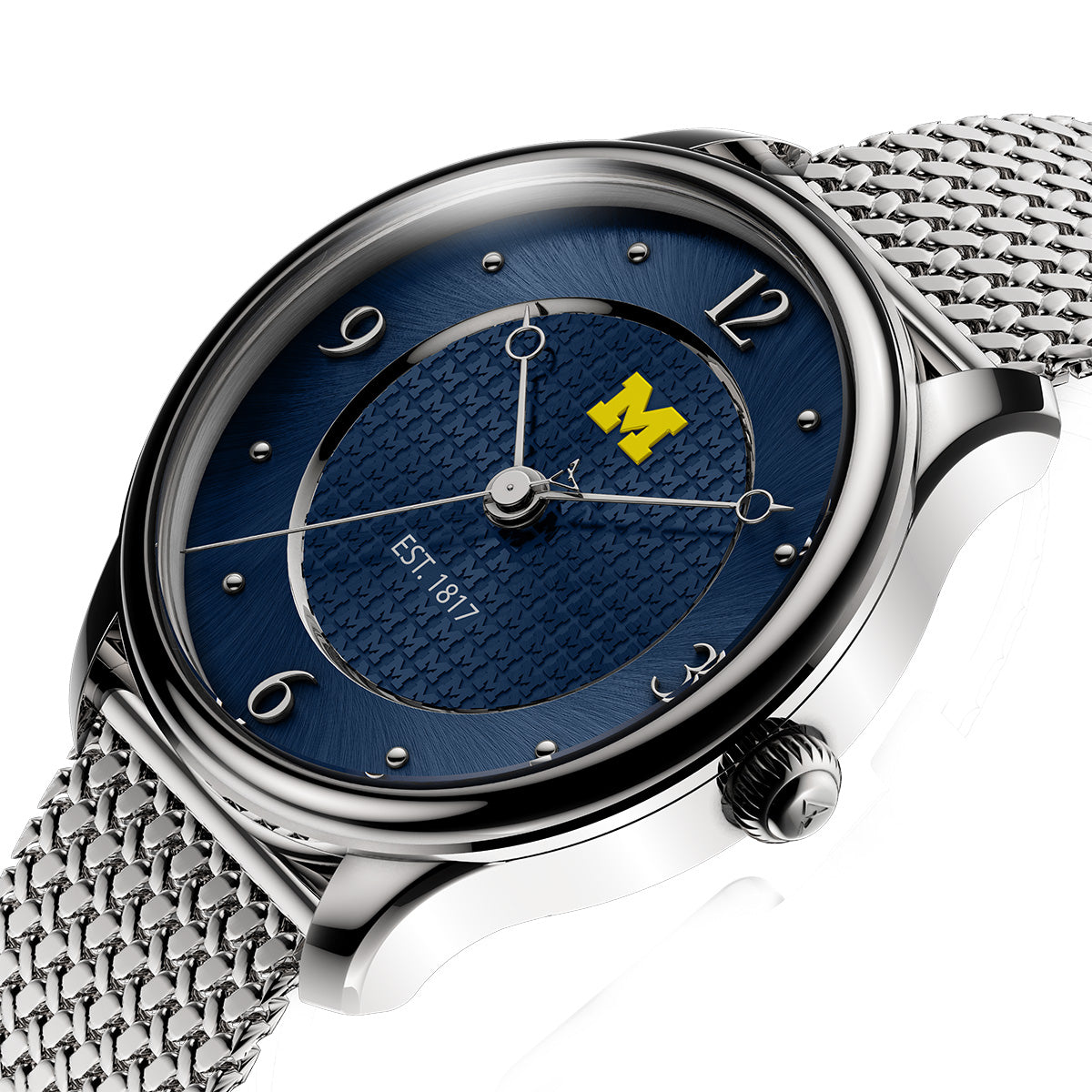 From the Greek word ΑΛΗΘΕΙΑ, meaning truth. This collection combines elegance and style in a polished 36 mm stainless steel case with a multi-tiered dial featuring a snail-brushed finish and the block "M" embossed in a repeating pattern. Diamond cut hands and applied polished indexes, and 3-hand movement complete this automatic (self-winding) timepiece.