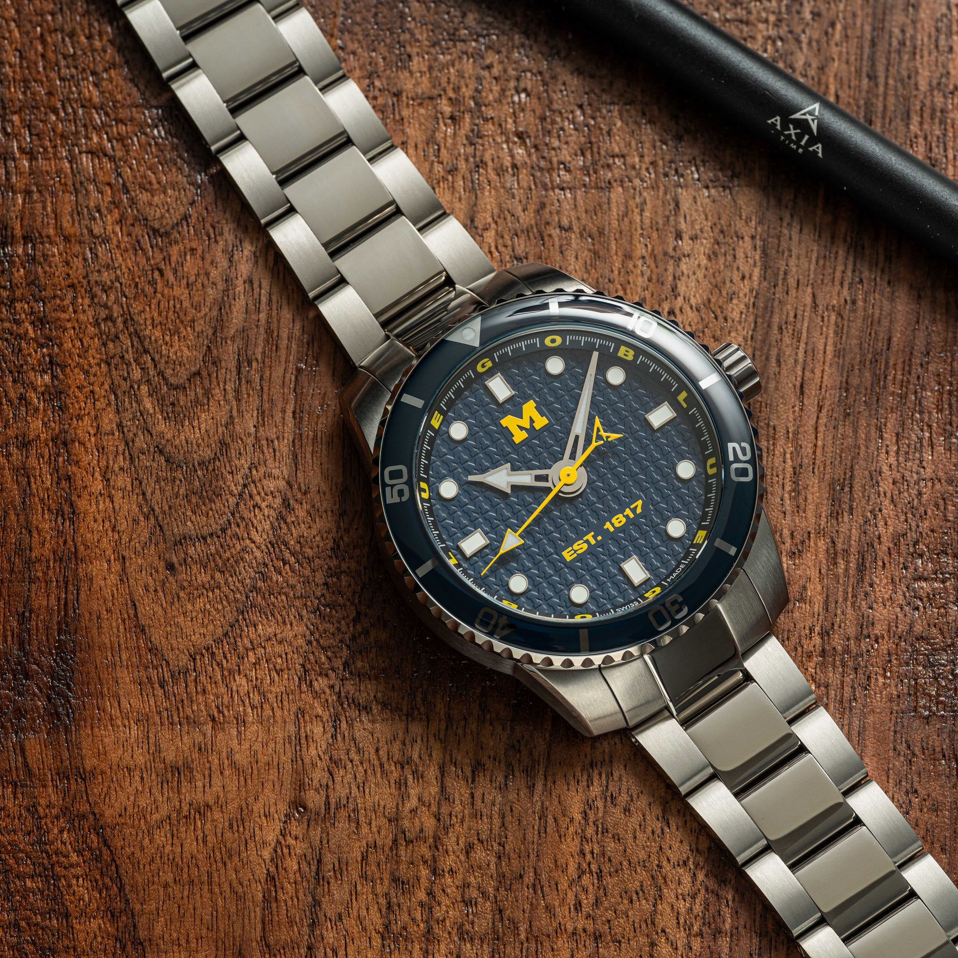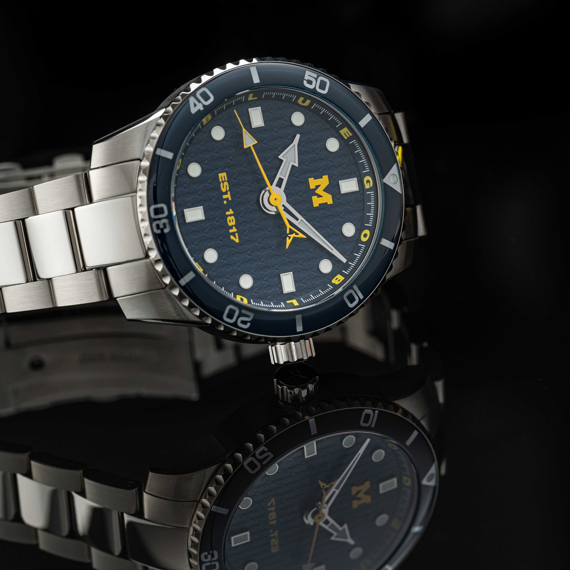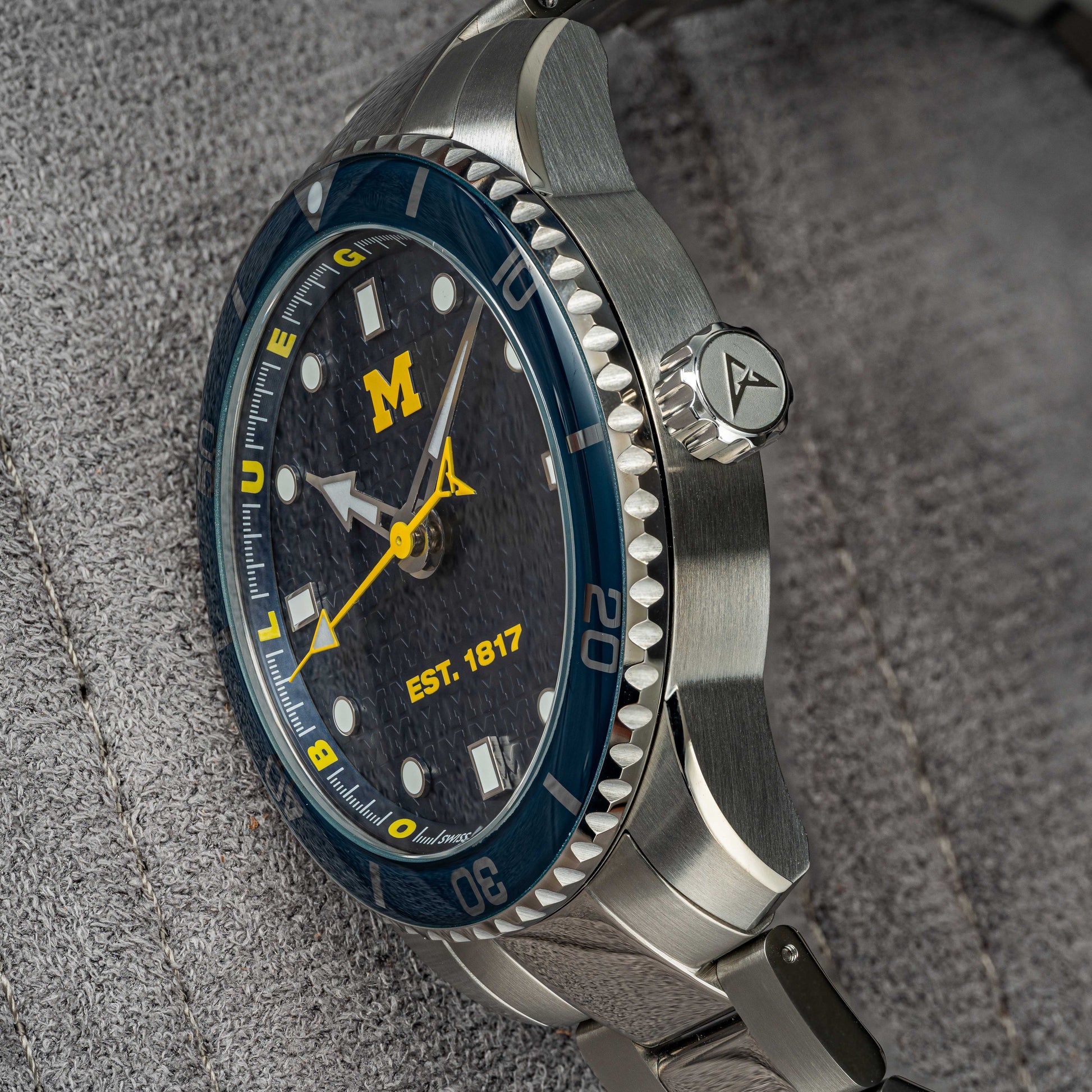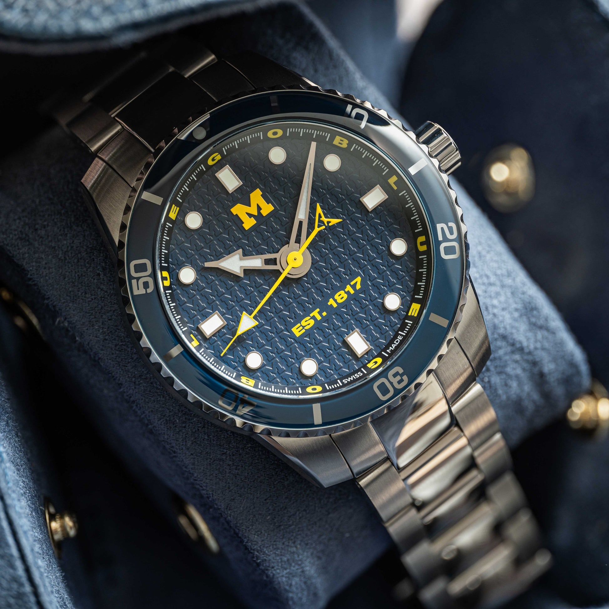 Named for one of the greatest heroes in literary history, ΟΔΥΣΣΈΑΣ—a man of intellect and versatility, strength and endurance. The University of Michigan Odysseus II comes in a 43.5mm brushed stainless-steel case with screw-down crown and is water resistant to 200 meters.