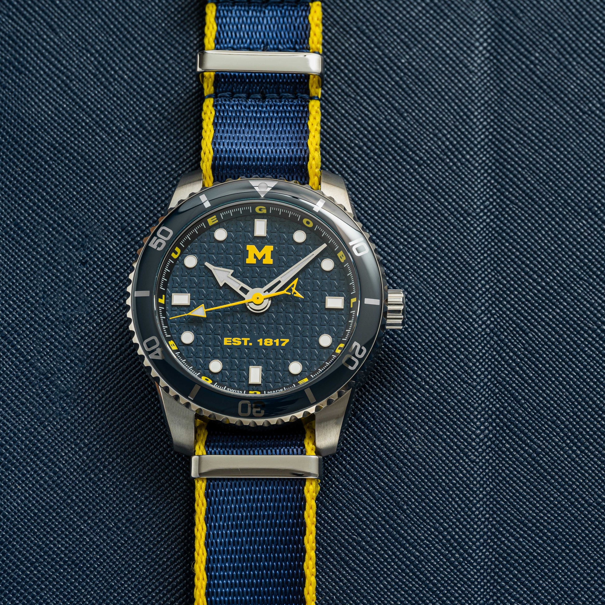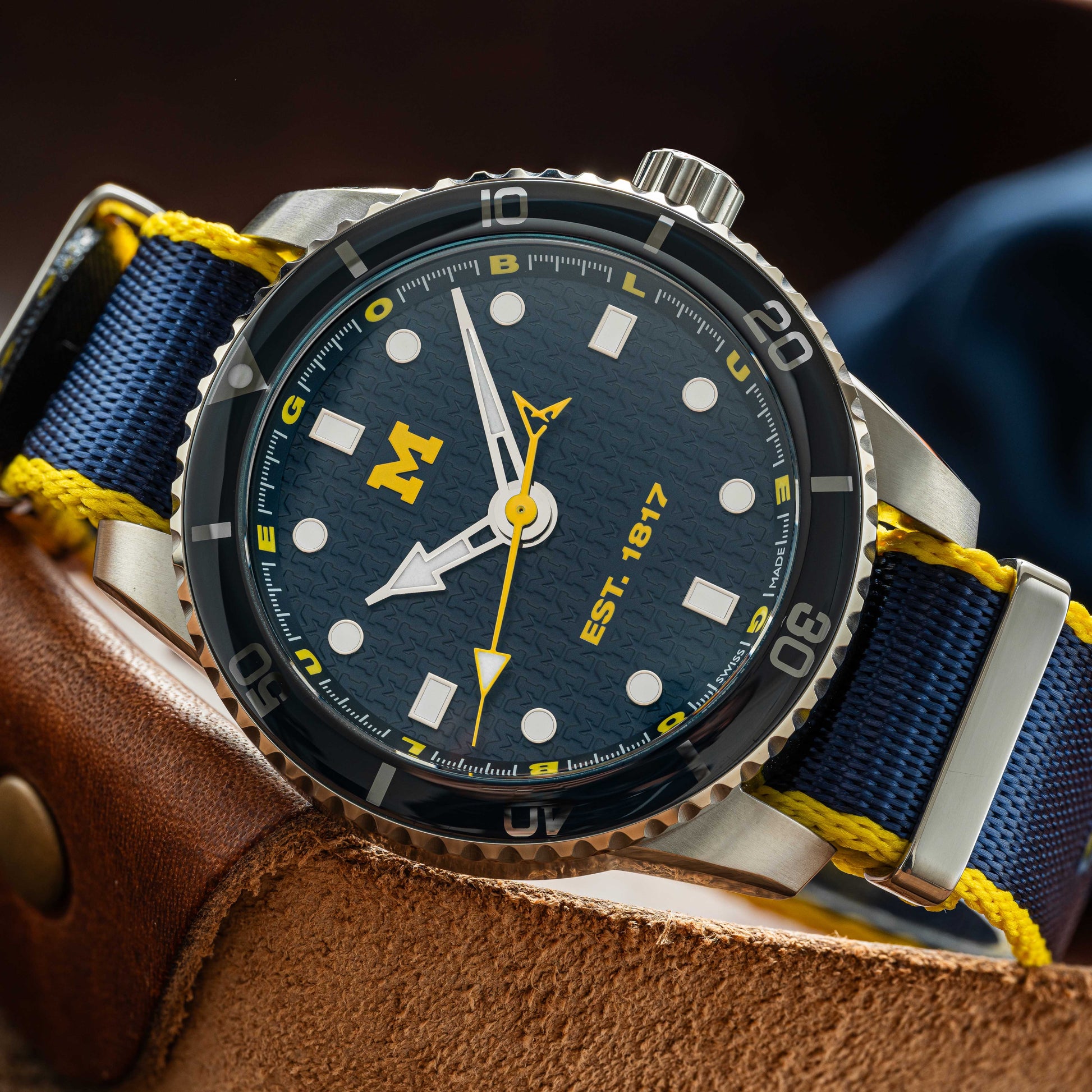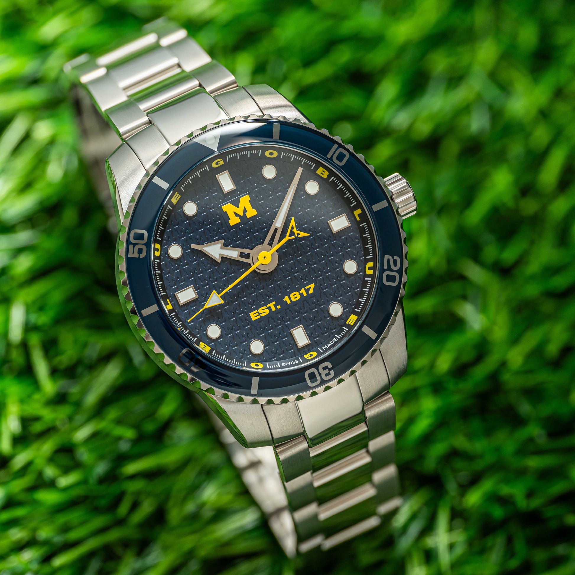 Named for one of the greatest heroes in literary history, ΟΔΥΣΣΈΑΣ—a man of intellect and versatility, strength and endurance. The University of Michigan Odysseus II comes in a 43.5mm brushed stainless-steel case with screw-down crown and is water resistant to 200 meters.